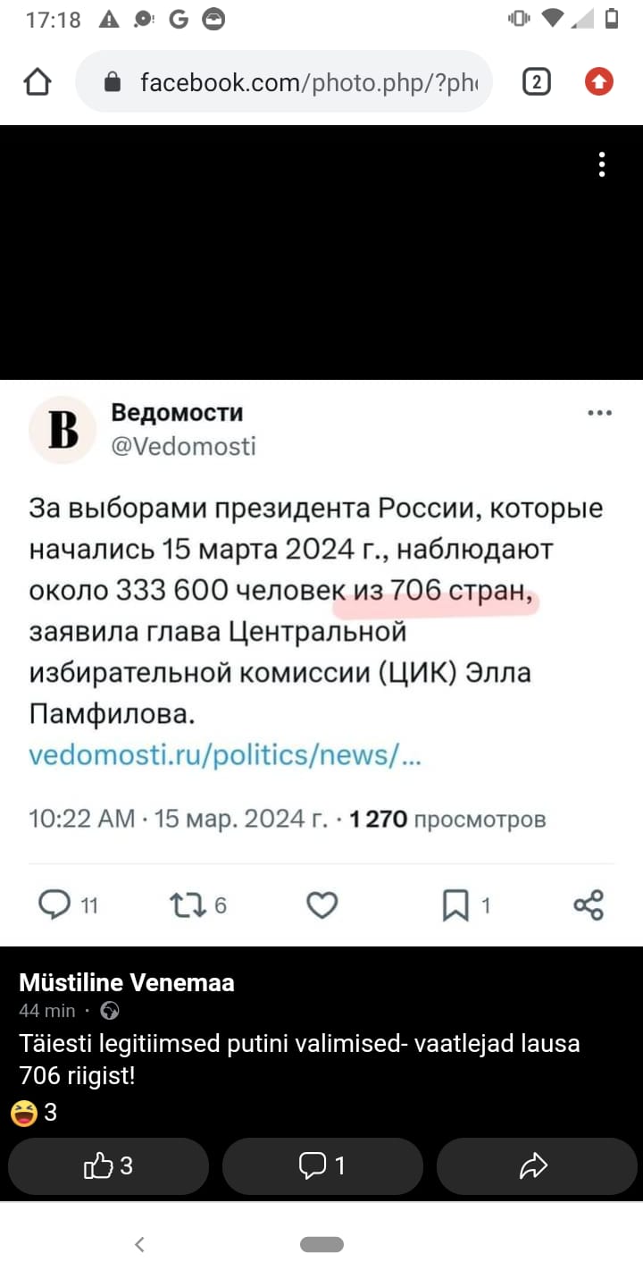 Originaallehel on ära muudetud. Nüüd siis 700 vaatlejat 106 riigist...Tarmo Männard kirjutas: ↑18 Mär, 2024 2:53 Vene presidendivalimisi jälgisid 333 600 inimest 706 riigist.....