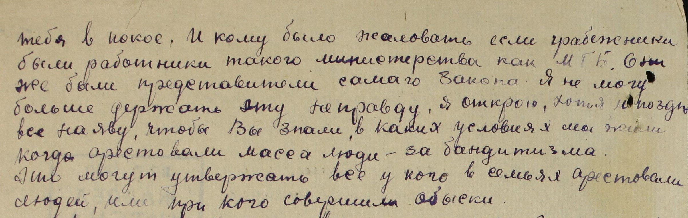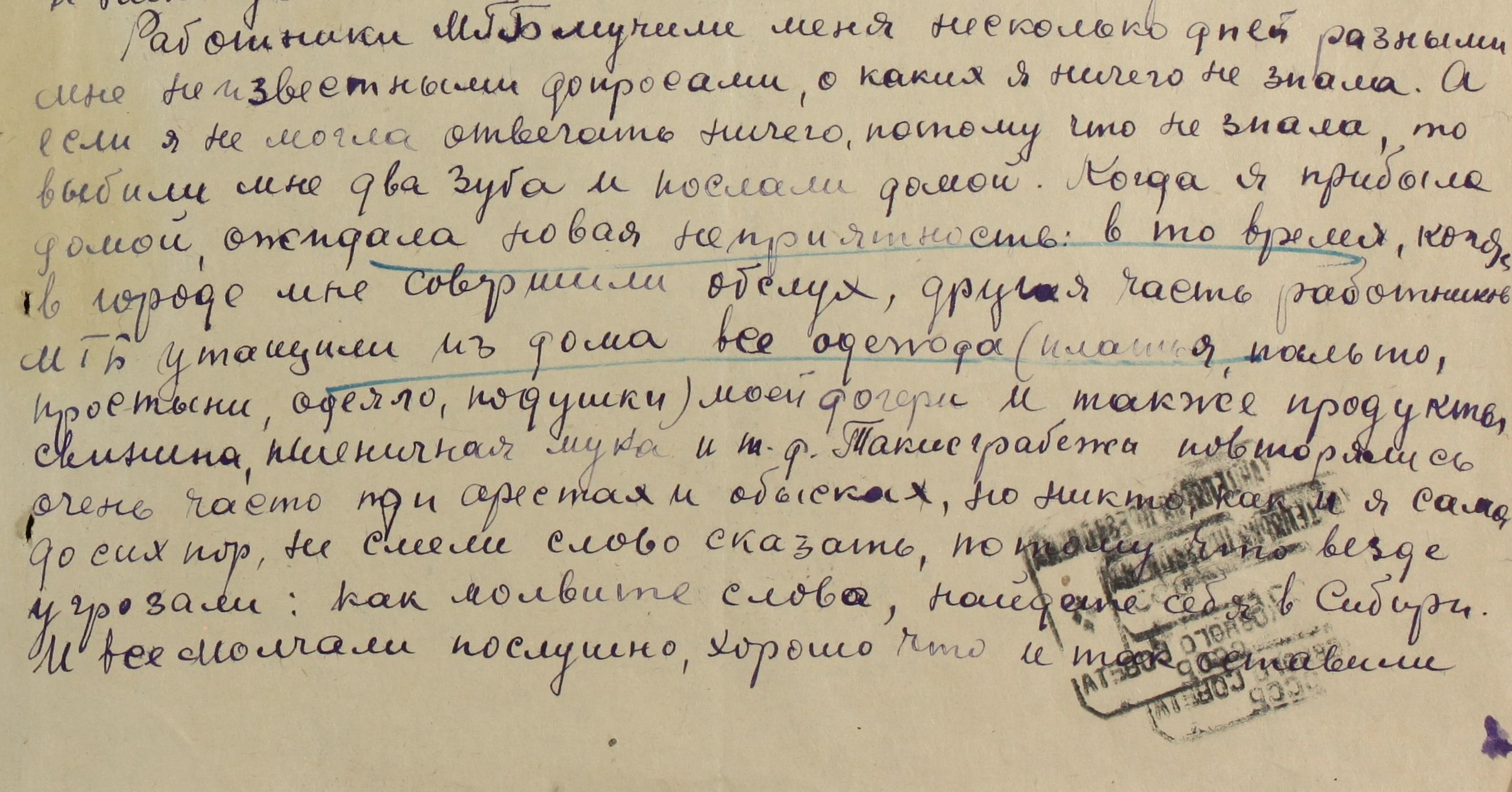 Lisan väljavõtte ühest kirjast, kahjuks ei ole sellist aega, et see tekst hetkel ümber tõlkida. See on üks näide paljudest kuritegudest, kus kohalik julgeolek vägivallatses peaaegu 70 aasta vanuses naisterahvaga, kelle poeg ja tütar olid vangistatud. Kiri on adresseeritud NSVL Ülemnõukogu presiidiumi esimehele marssal K.E.Vorošilovile ja kirjeldab kuidas ülekuulamisel tema esihambad välja löödi. Koju saabudes selgus, et maja oli julgeoleku töötajate poolt paljaks varastatud.