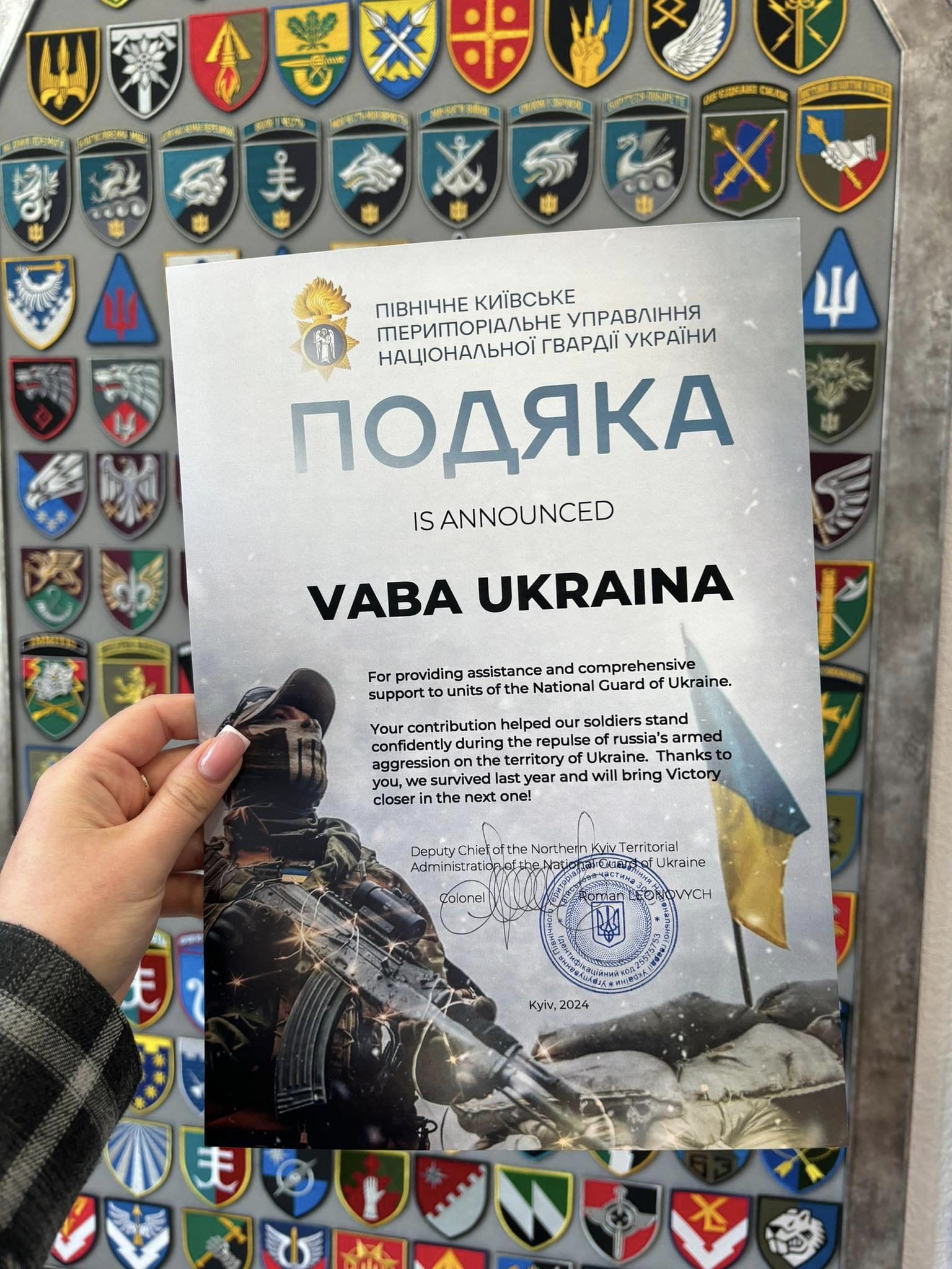 Põhja-Kõjivi Rahvuskaardi ülema tänukiri, tänud kõigile, kes meie tegevust ja Ukraina aitamist toetanud on.
