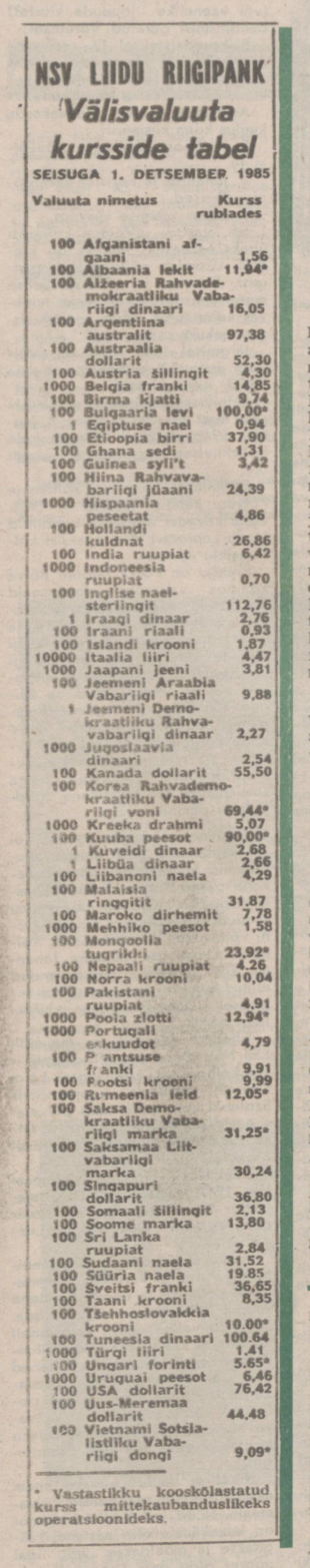 Näiteks 1985. aasta 1. detsembril maksis USA dollar NSVLi riigipanga ametliku "vastastikku kooskõlastatud kursi" (mida iganes see siis tähendas) järgi 76,42 kopikat: