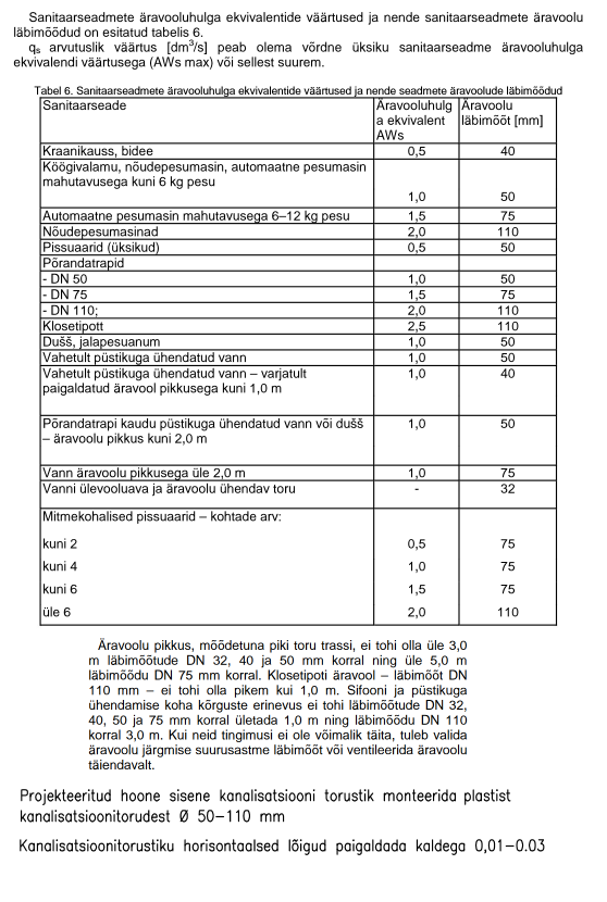 Üldjuhul (rusikareegel) on, et kuni DN50 horisontaalse toru kalle on vähemalt 1% (0,01), DN75 kalle 1,5% (0,015) ja DN110 kalle on 2% (0,02).