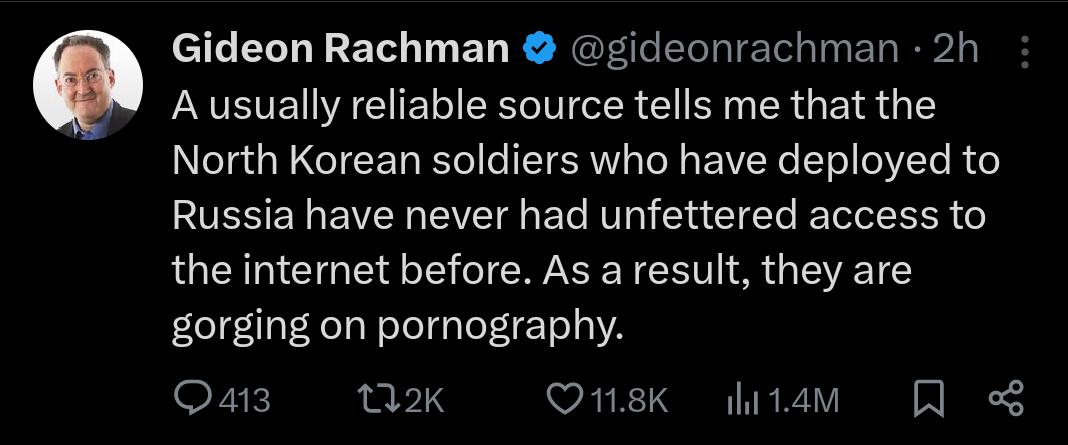 "Suure" tõenäosusega hoolitseti selle eest, et nad saaksid omale nuti telefonid või muud vidinad ja saadeti kohe kasarmusse või sanatooriumisse onaneerima.paadikapten kirjutas: ↑06 Nov, 2024 14:51 Räägitakse: P-Korea sõdurid, kes enne pole näinud vaba internetti, muutusid Vene armees pornosõltlasteks.