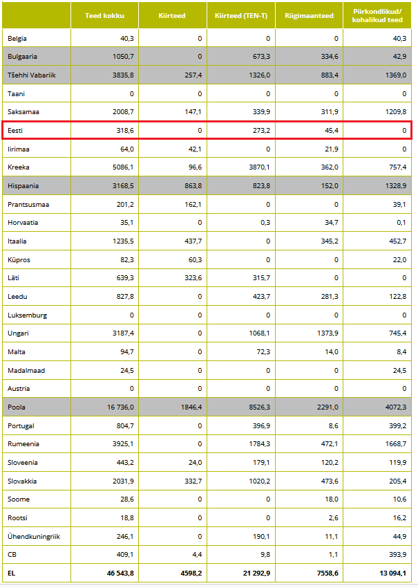 Euroopa struktuuri- ja investeerimisfondide eraldised maanteevõrkudele ajavahemikul 2014–2020 .