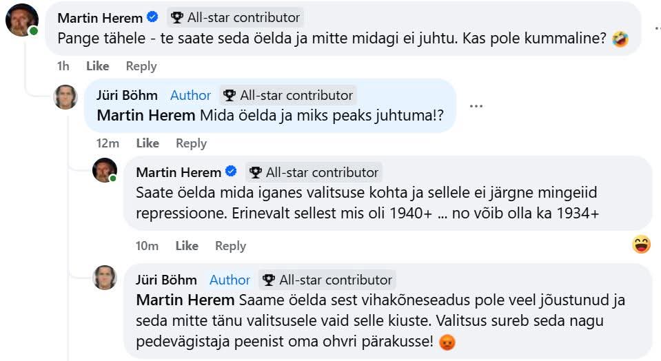 Seda ta parastavalt ootab jah, ja siis on valus lugeda, et keegi kaitseb tema maailmavaadet siin.Sho kirjutas: ↑07 Dets, 2024 20:29 Varro on oma lipunduses lihtsalt järjekindel - kui vaenlase lippu Pika Hermanni otsa tõmmata ei saa, siis vähemalt ärgu olgu ka sõprade ja liitlaste lippe kusagil. Tehkem venemeelne riigipööre kasvõi selle vastiku Eesti lipu all, küll hiljem võimul olles selle välja vahetame.