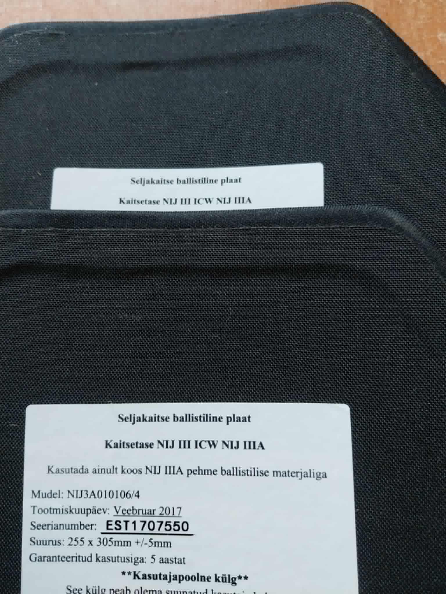 Brittide standardid, SG1 on 12 cal sileraudne ja RF1 vintpüss, põhimõtteliselt vastab NIJ III klassi. Kui tasuta antakse ja on terved, siis võta vastu. Mingi killukaitseplaat ka alla. Plaadid on valmistatud sügisel 2011, nii et kindlasti mingi ametliku nägemuse järgi vanavõitu, kuid see ei tähenda, et oleksid halvad.