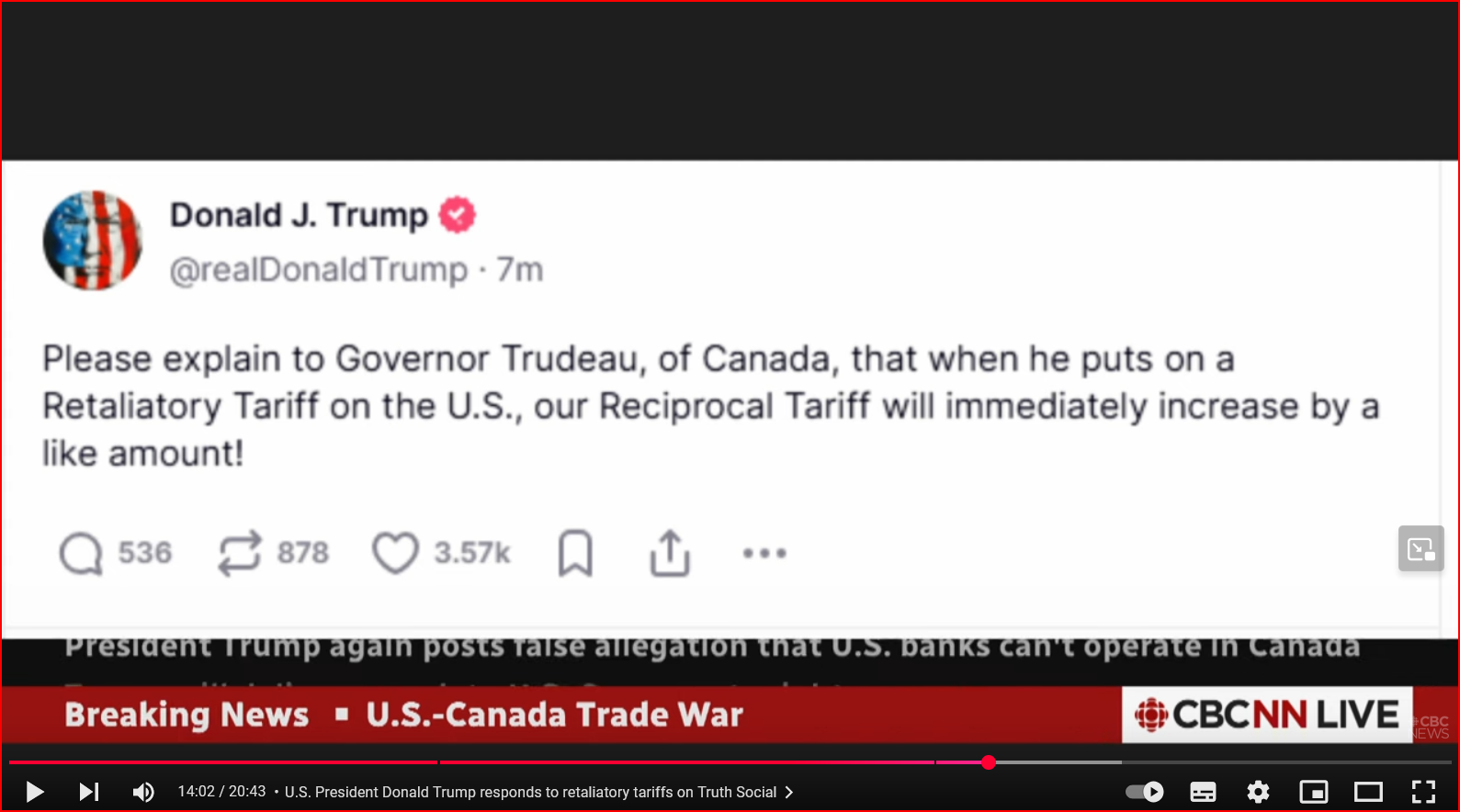 Kanada vastus kaubandussõja alustajale: https://www.youtube.com/watch?v=wz_42pckM7w. Kanada määrab ka omalt poolt 25% tollitariifid.
