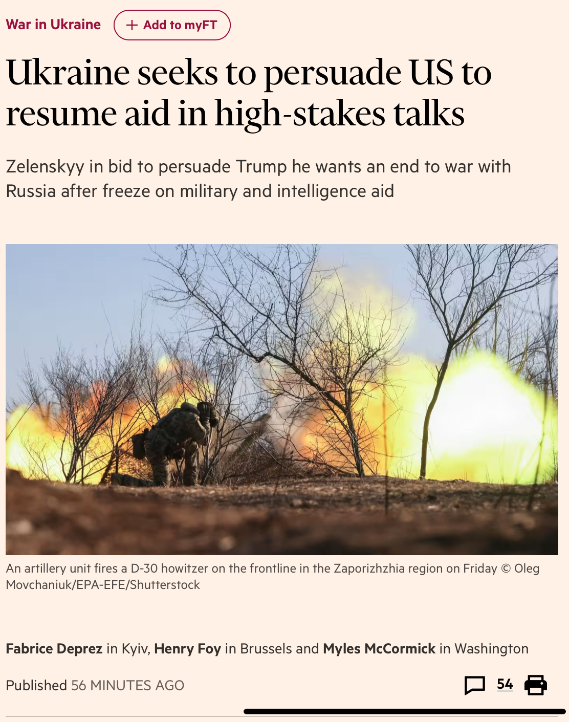 kaur3 kirjutas: 09 Mär, 2025 22:37 Ukraina püüab sel nädalal veenda USA-d taastama luure- ja sõjalise toetuse andmist olulistel kahepoolsetel kõnelustel, veendes Donald Trumpi, et Volodõmõr Zelenski soovib sõjale Venemaaga kiiret lõppu.