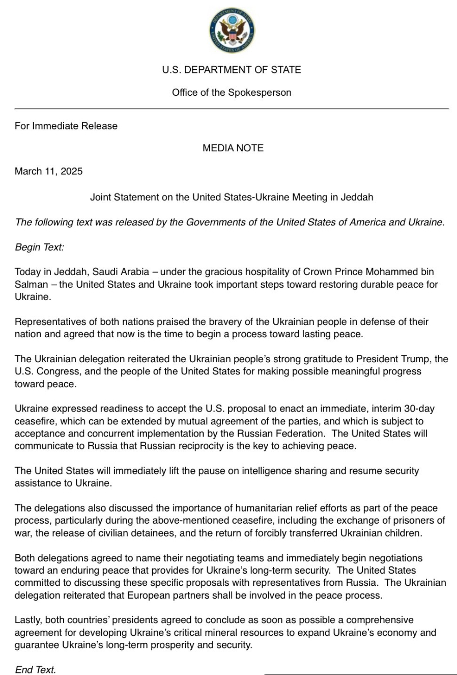 https://x.com/JimmySecUK/status/1899521536454775001The U.S. "will immediately lift the pause on intelligence sharing and resume security assistance to Ukraine” according to a joint U.S. - Ukrainian statement.