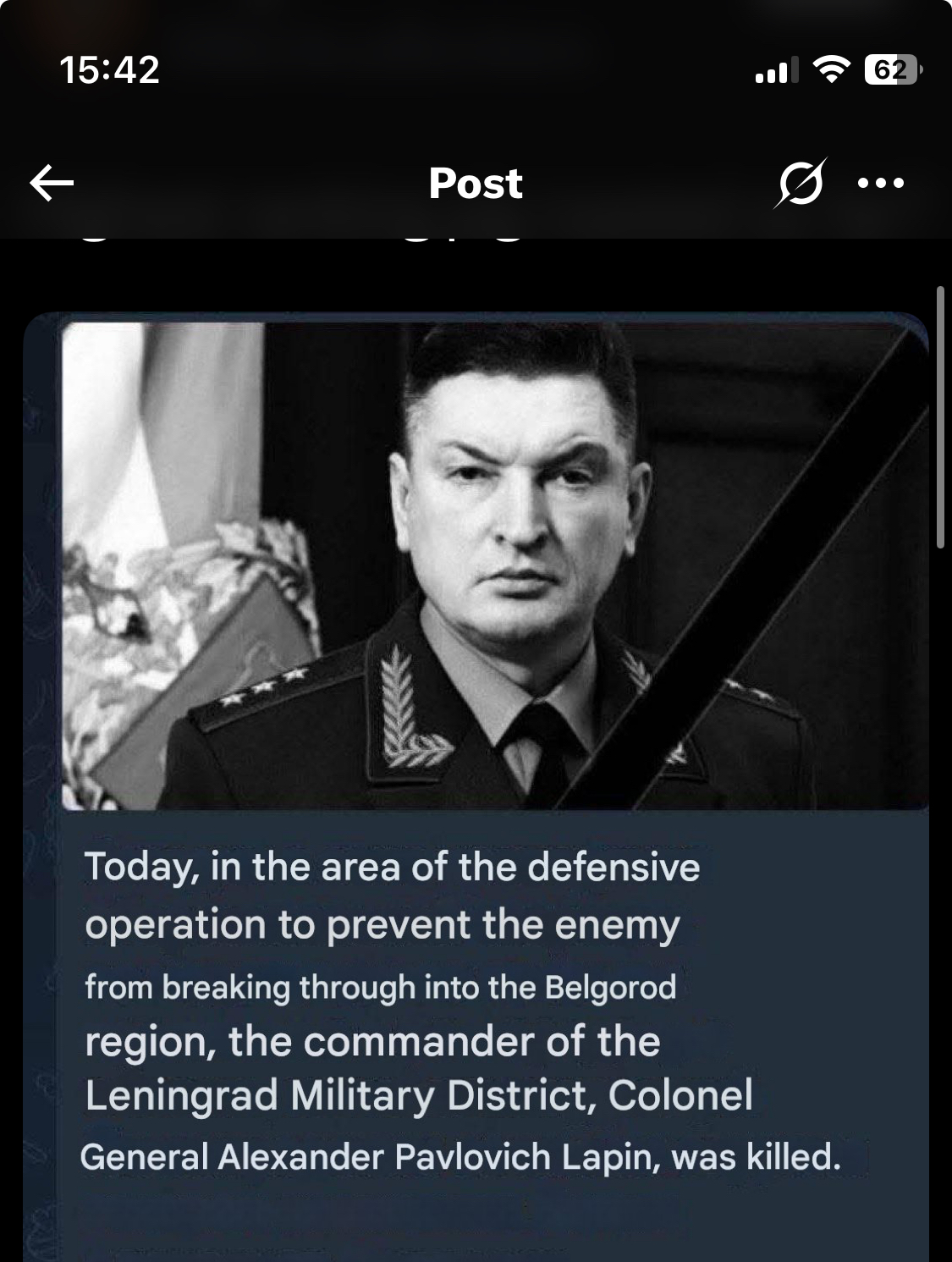 Kas see Lapin ei ole mitte kõige kõrgem ohve,kes sõja käigus tapetud?Ma nagu ei mäleta,et kindralpolkovniku aukraadiga mees oleks kasti lõõdud.