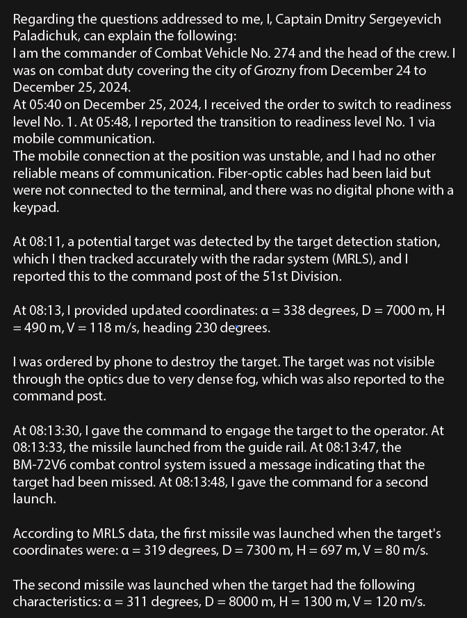 See ei ole selgitus, see on lihtsalt tõlge. Venekeelne originaal on ZRK meeskonnaülema (auaste kapten) ettekanne toimunust intsidendist lahingvalves nr1 24-25.12.2024. NB! See ettekanne on PVO-PRO ülemale tehtud (tõenäoliselt sisejuurdluseks) 27.12.2024, s.o. kaks päeva peale lahingvalvet.