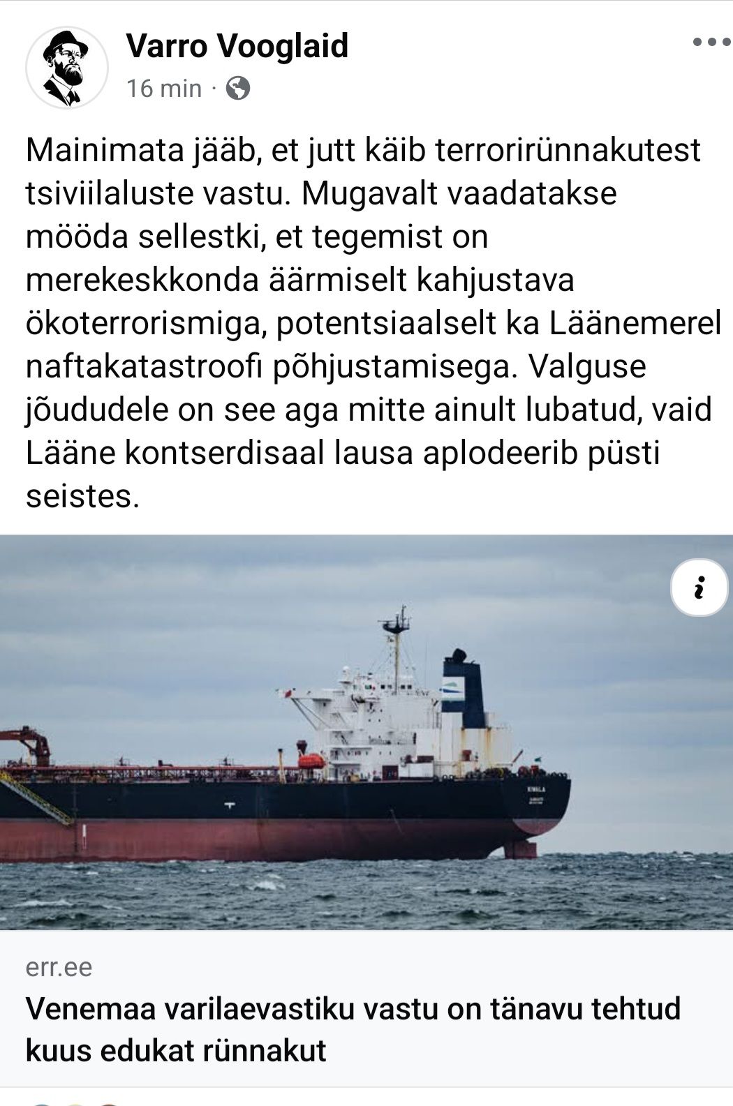Vurru arvates need terroririigi varilaev-alused vist hõljuvad õhus ja lasevad toredasti meie vete suunast mannavahtu välja, ime et ta kaitse alla ei tahaks võtta neid.