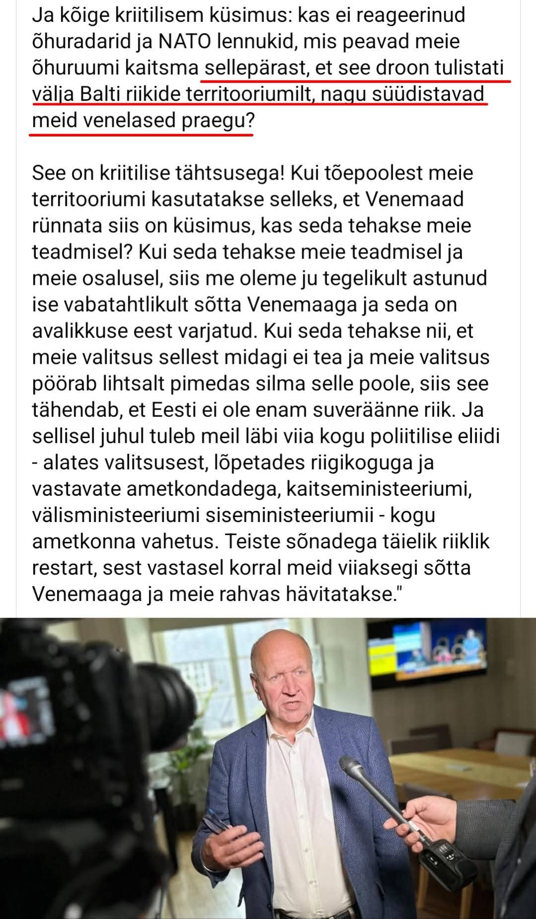 https://www.facebook.com/erik.arro.5 FB on artikli otselinkimise üsna võimatuks teinud.Need M ja M Helme ja V Vooglaidi krokodilli pisarad ja paanika, meeletu hirm Moskva ees meenutab moskoviitliku diktaator Pätsi argust, sõpruslepingut Staliniga, lömitamist ja vaikivat ajastut, mis lõppes teadagi kuidas - ilma liitlasteta, alistudes juba enne sõda, lõpetades Vene terrori ja genotsiidiga.