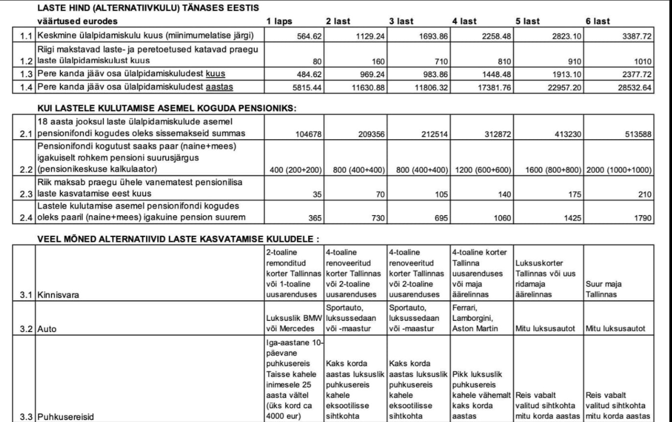 * - lisaks on arvutus täiesti ilmselgelt vigane kui võrdsustab esimese lapse kulu kõigi järgnevatega. Ma ei viitsi siin seda taas hakata ümber lükkama.