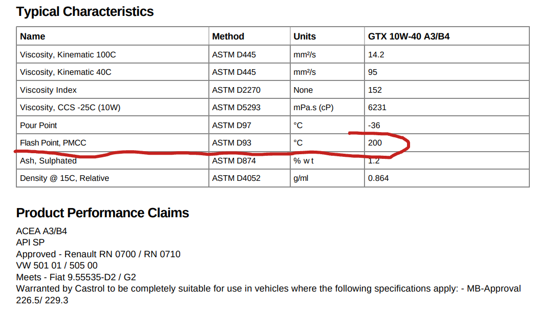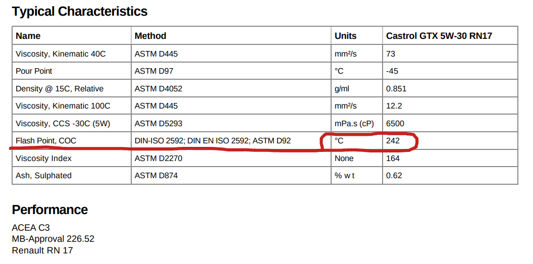 Toon näidiseks ühe tootja, Castroli lehel avaldatud tehnilistelt kaartidelt mõnede erinevate õlide süttimistemperatuurid: