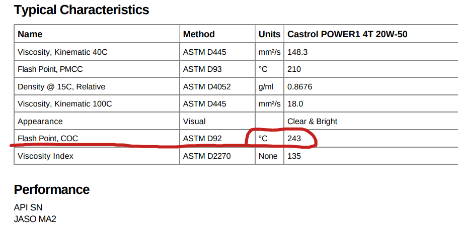 Selle mootorrattaõli Mobil 1 Racing 10W-40 leekpunkt on 204 kraadi C, sama viskoossusega autoõli Mobil 1 10W-40 leekpunkt on 241 kraadi. :D