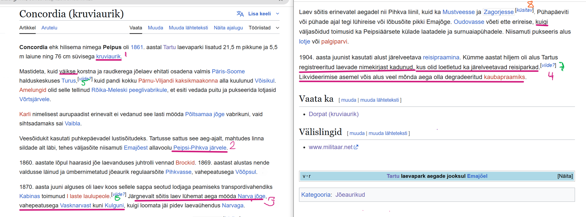 1. „Ära väida viidatud allikale vastupidist!” Alla on joonitud sõna kruviaurik. Allikas ei viita mingilgi moel, et „Concordia” olnuks kruviaurik. Vastupidi- allikatekstis on sõnad rattakast ja sõurattad. Wikinupust on need ära kaotatud. Kahel fotol, kus „Peipusena” veel iseliikuvana jäädvustunud, on rattakastid esiplaanil. Praamina fotol neid loomulikult ei ole, kaksati laeva ümberehituse käigus lihtsalt küljest ära. Milleks neid segavate asjaoludena enam hoida?