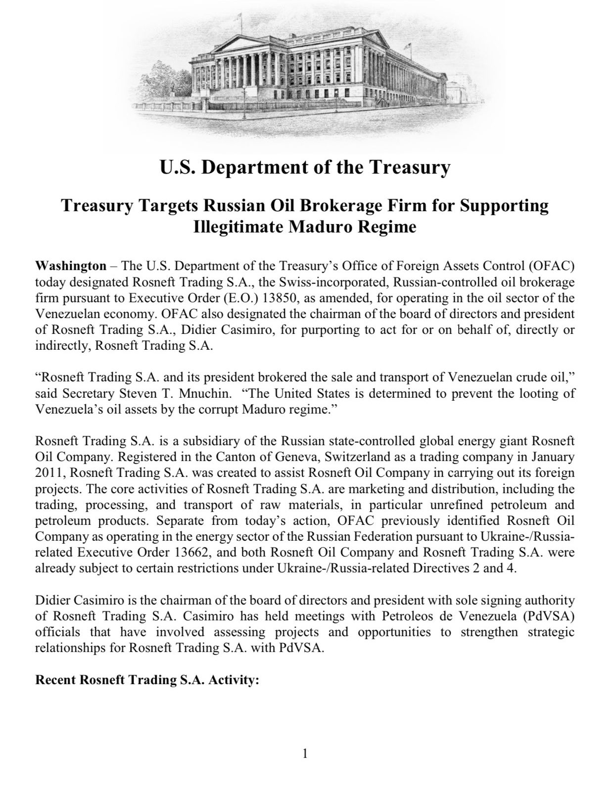 USA pani Rosneft Trading SA-le sanktsioonid.