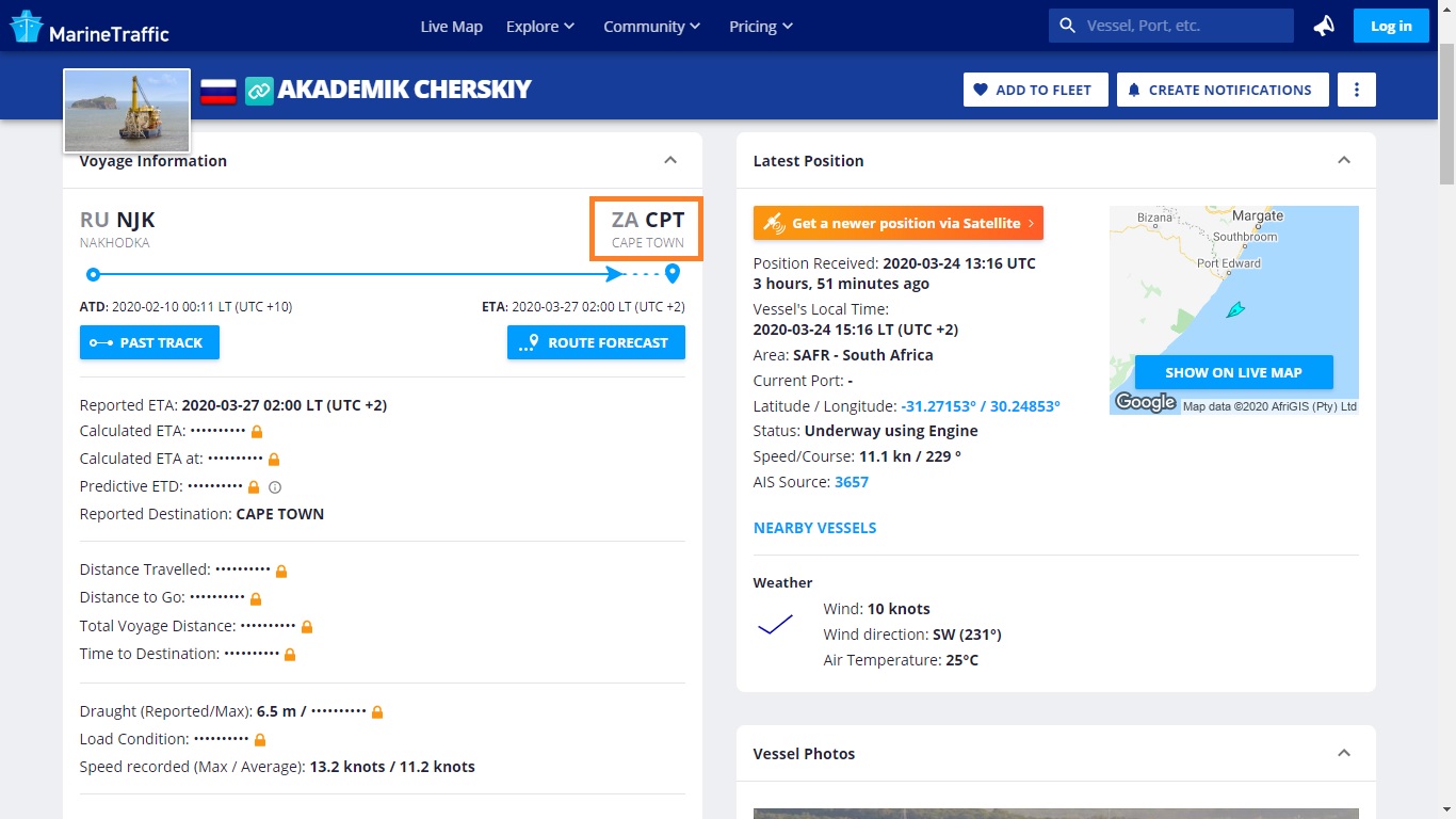 Akademik Tšerski nüüd taas nähtav ka Marinetrafficus. Maputost ja selle reidist peatumata möödas, uus sihtsadam... Taraa! - Kaplinn.