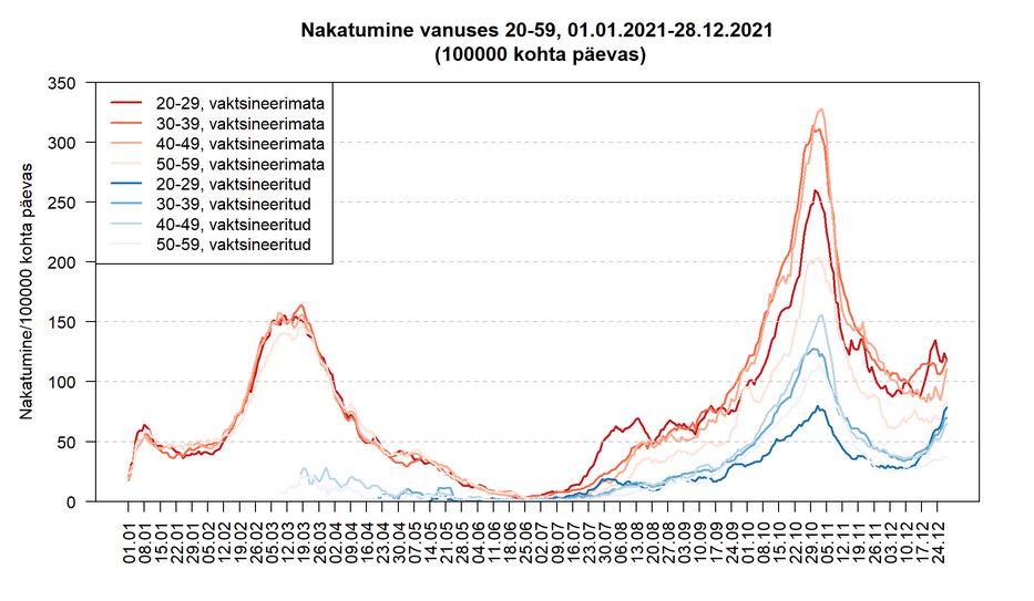 Seisuga 28.12.2021 on nt. vanusegrupis 20-59 mittevaktsineeritud nakatanuid 2x rohkem kui vaktsineeritud nakatanuid. Sama on umbes ka teistes vanusegruppides.