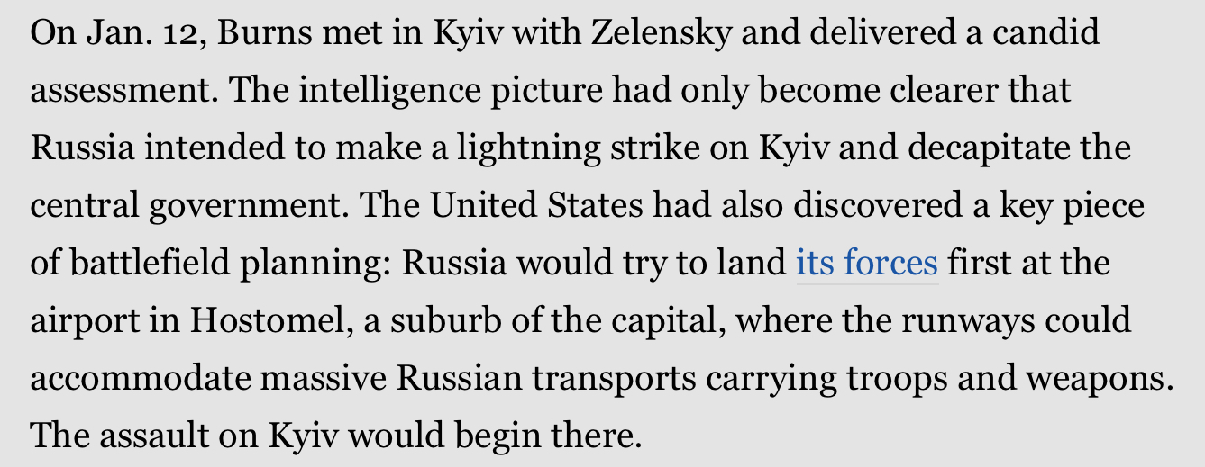 Tuleb kuulata mida USA räägib. CIA pealik Burns hoiatas ukrainlasi 12.01.2022, et venelaste sõjaplaani löök on suunatud Hostomelile. 24.02.2022 ei olnud Ukraina selle löögi vastuvõmiseks lennuväljal valmis. Huvilised saavad enda valitud tõlkemootoreid linkide tõlkimiseks kasutada.
