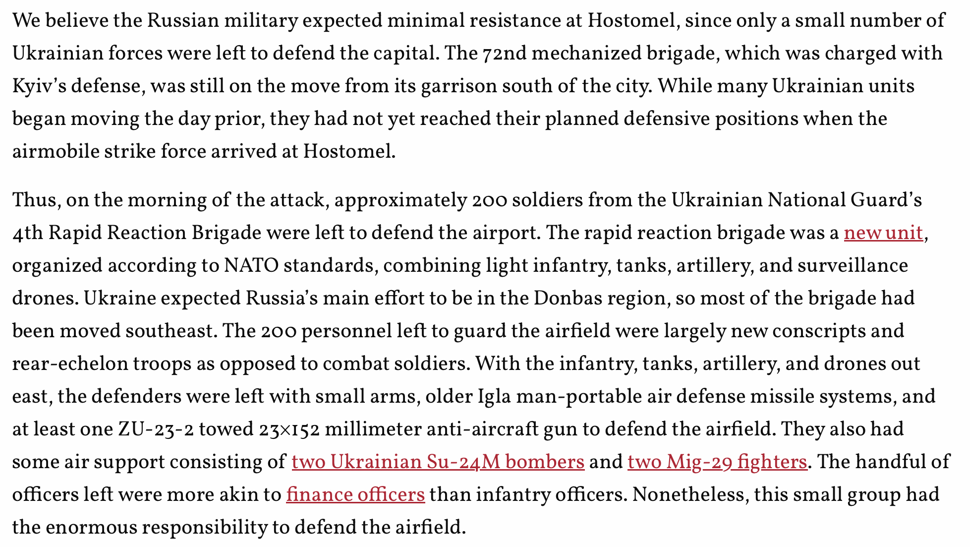 Loen seda ja tundub, et ukrainlased tegid kõik õigesti Hostomeli rünnaku tõrjumiseks. Väike hajutatud üksus (aga piisav esimese laine blokeerimiseks) hoidis ala, lennurada oli blokeeritud rekkadega (näha tolle aja videotest), peamine löögiüksus oli liikumises, mis tegi selle pihta raketilöögi andmise võimatuks. Tõenäoliselt ukrainlased eeldasid, et nii lennuväli kui 72. saavad suurema raketisaju, mis oleks loogiline ja sellest ka vastavad liigutused. Kui sa soovid, et vaenlane läheks oma lolli plaaniga edasi, siis sa ei kindlusta ennast nii tugevalt, et vastane loobuks plaanist.