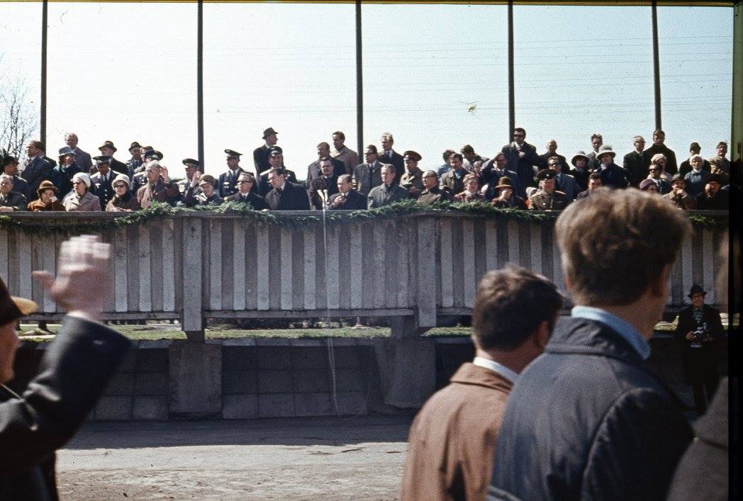 Autor on prillidega mees tribüüni ees paremal, fotoaparaat käes - Kaljo Kriibi.