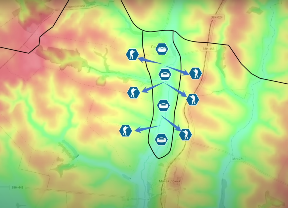 If we look at the topographic map, we can see that the road and settlements leading to Malaya Loknya run through the lowlands, surrounded by forests and hills to the west and east. Ukrainians withdrew from the settlements to the high ground, letting the Russian convoy pass through and allowing it to be destroyed by previously placed mines and FPV drones.