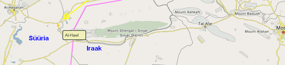 Kaart ka: Lillaga on riigipiir, geograafilise mõõtme annab hasaka-Mosuli liin vasakus-paremas servas.