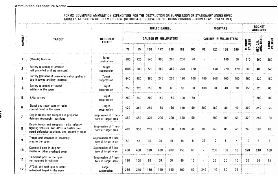 Kui me räägime ettevalmistatud rünnakust kaevunud kaitsja vastu, siis on vaja vaadata 122mm, 152mm ja reaktiivsuurtükiväge. Ning nende tabeleid.