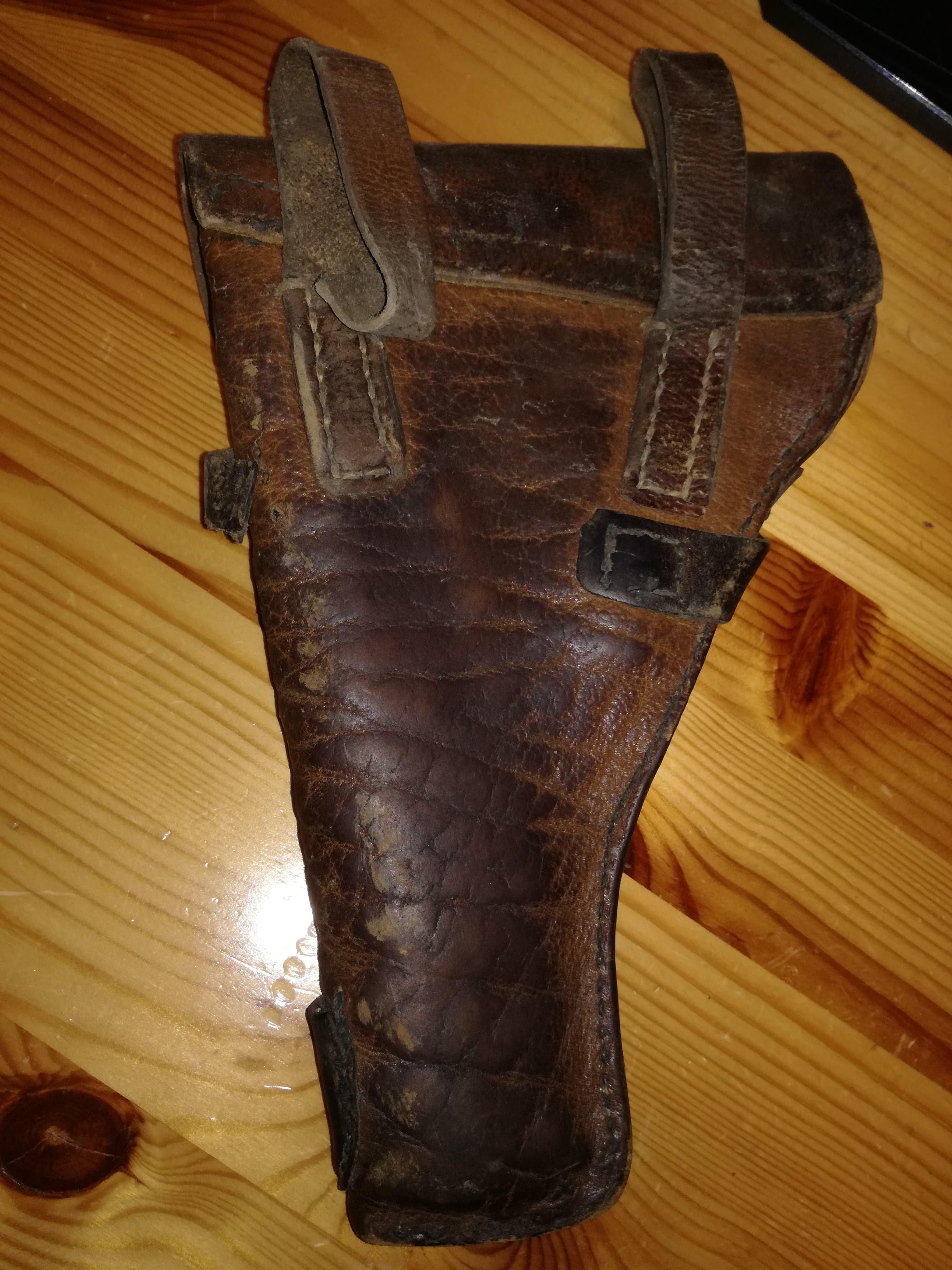 Kas sel kabuuril mingisugustki tootjamarkeeringut on kuskil? Minu arvates kõige tõenäolisemalt millalgi üheksakümnendatel mõnes nahatöökojas tehtud üksiktellimus. Tartus oli kunagi üks firma, mis taolisi asju tellimisel tegi (kabuure, tääginahku, igasugu nahkrihmu) ja tegumoe poolest võiks nende töö olla küll. Suur hulk erinevate püstolite puitmakette oli neil veel seal, nende järgi siis tehti. Hiljem hakkas juba igasugu korralikku Lääne toodangut siinkandis liikuma ja eks rahval oli raha ka juba rohkem, et neid osta, lisaks tekkis võimalus netist mida iganes ja kust iganes tellida. Selles suhtes väga huvitav lahendus, et varusalve koht on kabuuri peal. Ma pole sellist varem näinudki, muidu ikka külje peal või ees (P-08). Huvitav, mille jaoks see väike tasku külje peal võiks olla? Selsamusel parabellumil on selline relva hoolduseks vajaliku tööriista jaoks klapi siseküljel, aga kas on mõnd kaasaegset püstolit, millel vastav spetsvidin üldse olemas oleks, rääkimata sellest, et seda peaks kogu aeg lausa kaasas kandma? Lisaks veel puhastusvarda aasad, seda ju samuti muidu kaasas vedada vaja pole, kui just lausa sõtta ei kavatse minna. Kas mõnele kaitseliitlasele kuulunud asi?
