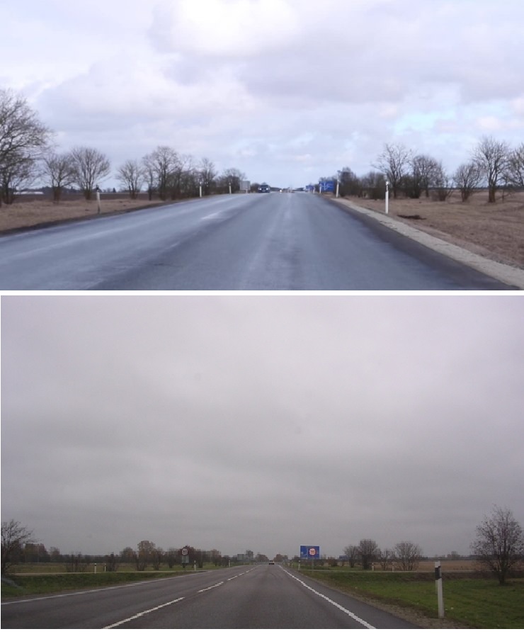 Esimesel pildil on RING Nr.1 vaade n.ö. "küljelt", kus on näha teeprofiili suuremat sorti kalle + jama täis istutatud ringristmiku keskosa, mille tagant ei paista välja ringil liikuvad sõidukid ega ole ülevaadet ka ristmiku vastaspoolel toimuvast. Teisel pildil on sama ringristmik kalde madalamas küljes asuvalt haruteelt ringile lähenedes. Ja kolmandal pildil on RING Nr.2 kus ringi keskele on kuhjatud sihilikult mulded. Eemalt vaadates ei varja need vaadet nii palju, kui lähemale liikudes, ehk mida lähemale ringile liikuda, seda kõrgemad need kuhjatised on ja seda vähem jääbvaba vaatevälja, et saada aru ristmikul ja teiselpool ristmikku toimuvast.