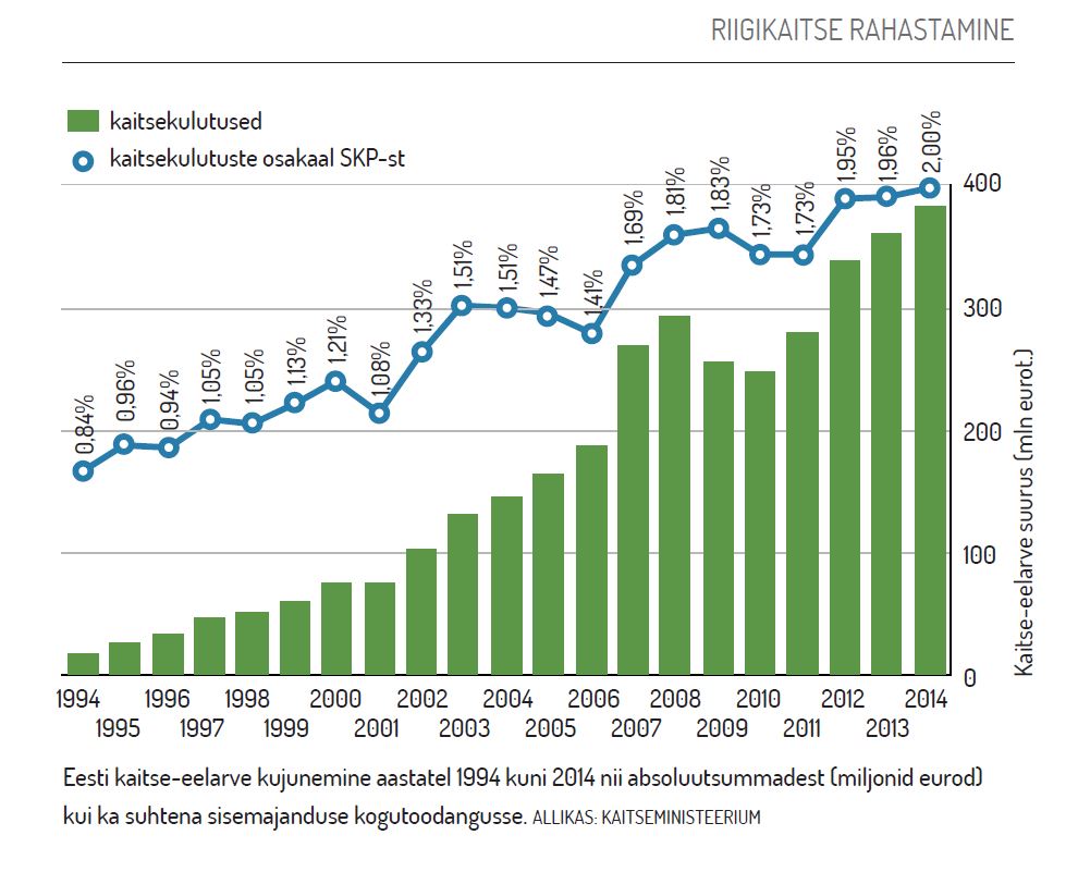 Soome kohta juba sai pilt pandud. Paneks siis Eesti kohta ka. Allikaks kmini raamat "Riigikaitse rahastamine" aastast 2014. Seepärast viimase otsa aastad puudu.