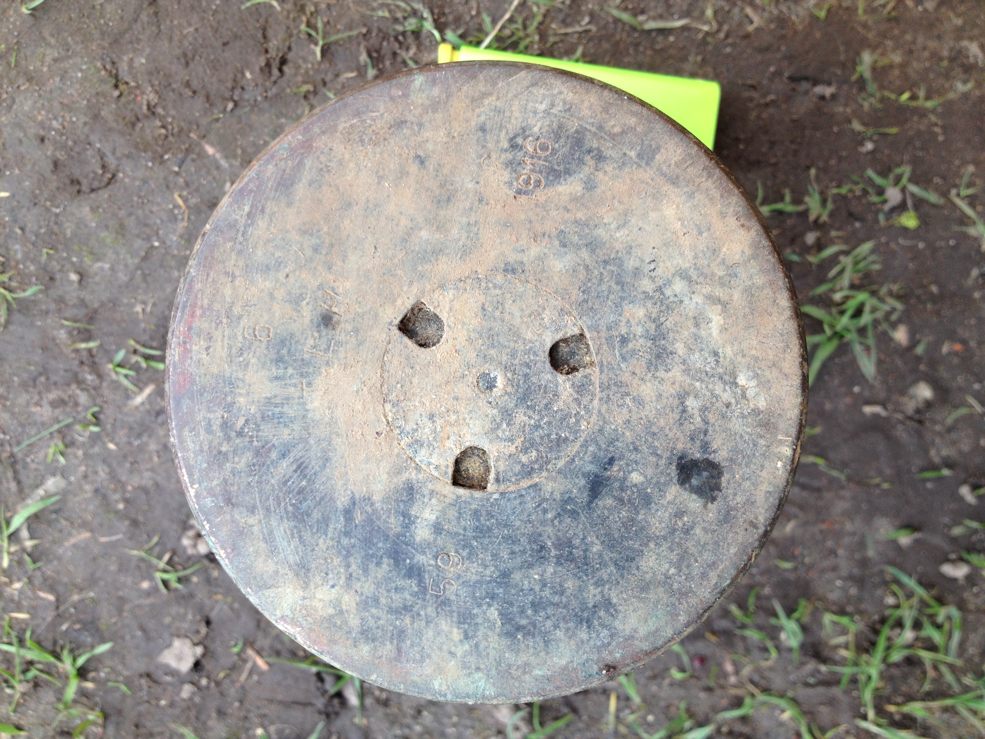 Sai ilusti kuhugi nurka ära tõstetud ning ~kuu aega on kuul õues vihma käes olnud - vihm on rooste ja muu mulla maha pesnud. Siis hakkas midagi huvitavat selguma. Kuulil on auk sees (läbimõõt ~7-8mm) ning sügavuselt ulatub täpselt kuuli keskele. Lisaks on markeering 7 1/4K (aru pole saada, kas G on veel järgi või mitte). Paaris kohas tundub veel markeeringuid olema aga see vajab juba traatharjaga puhastamist.
