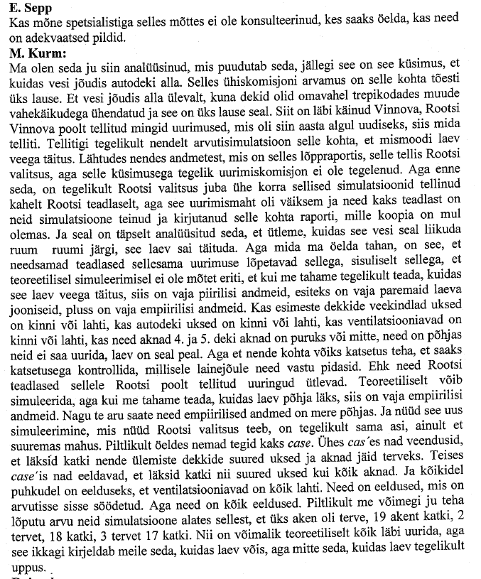 Viimasele (Kurmi kuulamise protokolli väljavõttes välja toodud) OLULISELE vajakajäämisele õnnetuse modelleerimises viitas ka TUHH ja SSPA oma hilisemates (2006a) põhjalikumates uurimisaruannetes.