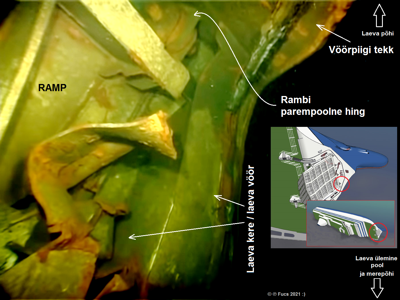 Rene Arikas via ERR 16.07.2021 kirjutas:Allveerobotiga tuvastati, et vöörirambi parema parda väike tükk on vöörirambi parema parda hinge küljes, et vöörirambi parema sisemise nurga tükk on puudu. Vöörirambi konstruktsioonil leiti erinevaid vigastusi, millest enamik on selle keskosas.