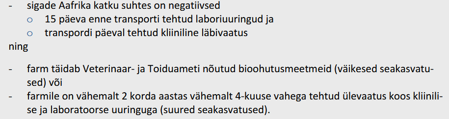 farm täidab Veterinaar- ja Toiduameti nõutud bioohutuse meetmeid (madalama bioohutusega väikesed seakasvatused) või farmile on vähemalt 2 korda aastas vähemalt 4-kuuse vahega tehtud ülevaatus koos kliinilise ja laboratoorse uuringuga ning kõik üle 60 päeva vanad sead on sigade Aafrika katkust vabad (suured seakasvatused),