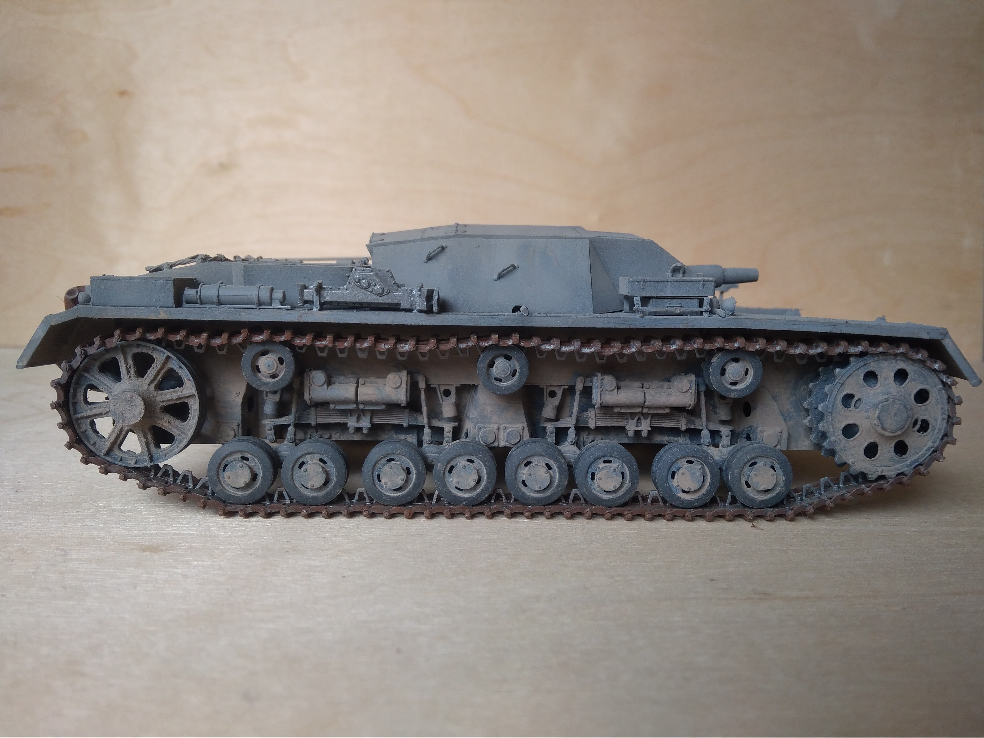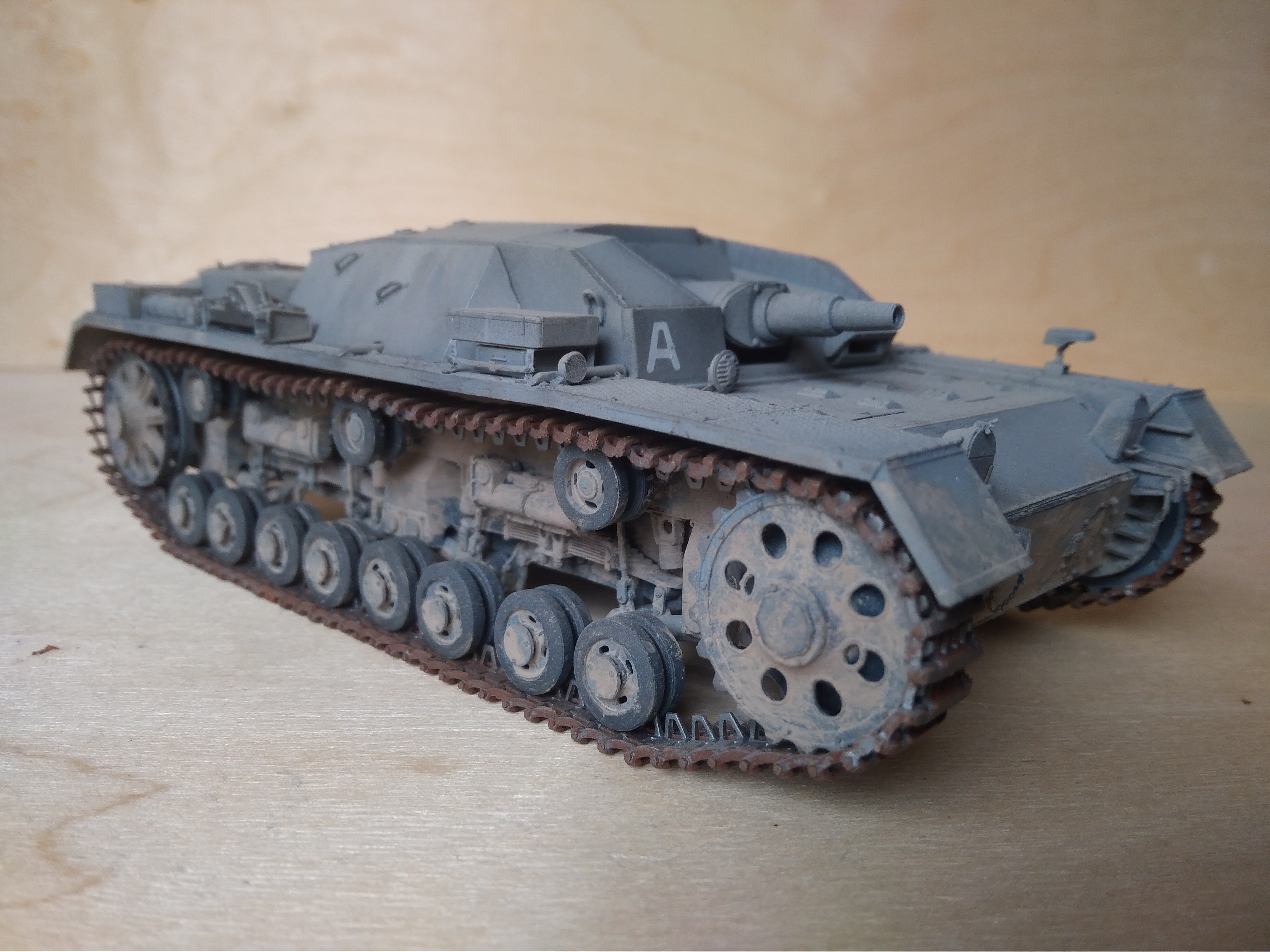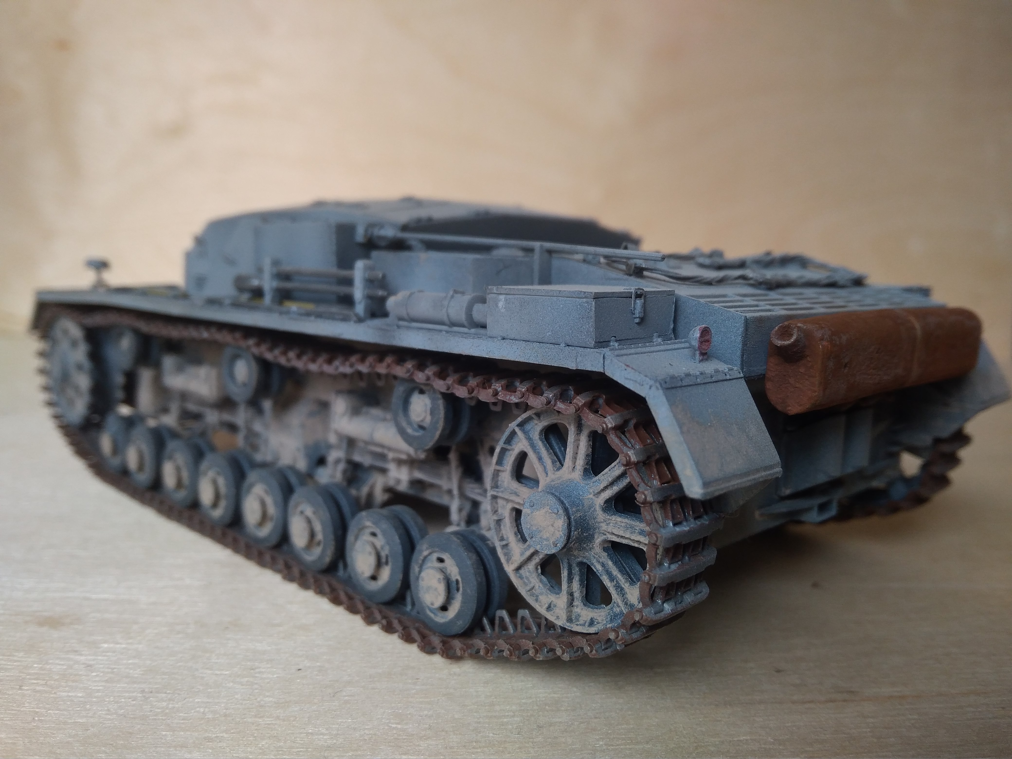 Enam vähem üheaegselt valmis jaapanlasega koos ka sakslaste 0-seeria sturmgeschütz III, Mini Arti toodang. Selle kokkupanek oli tunduvalt vaevalisem, kui Chi-Ha. Muidugi, kui võrrelda detailide arvu siis on see täiesti arusaadav. Kuigi need valmisid enam-vähem üheaegselt siis selle kokkupanek algas üle poole aasta varem (olen siin vahepeal jõudnud kokku panna veel venelaste OT-26 ja ühe lennuki, millest veidi hiljem). Vist oli lihtsalt vaimu puudus, sest mudel oli iseenesest väga hea. Ainuli üks märkimisväärne viperus juhtus, nimelt plaanisin masinale paigutada ristidega B-varjandi dekaalid. Viimase kleepsu paigaldamisel lagunes see lihtsalt ära ning olin sunnitud kõik maha võtma ja asendama A-varjandiga.