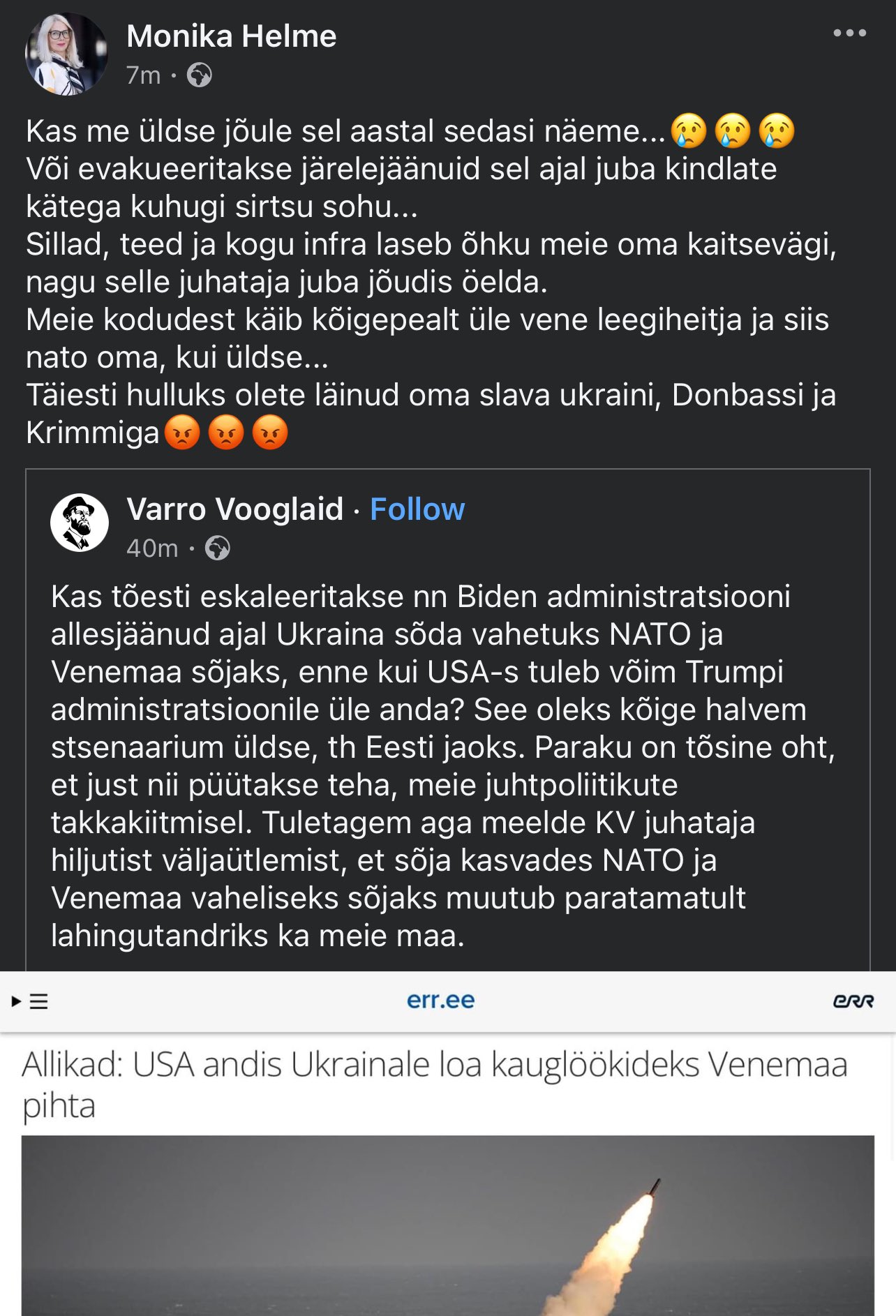 Aga peab olema täielik kremli rott et postitada siia link 30 aastat vanast juhtumist USA armees ja täiesti mitterelevantse lingi ÜRO rahuvalvajatest. Ise otsisid või kusagilt saadeti ?krizz kirjutas: ↑11 Nov, 2024 20:33 Ega ei pea just kosmoseteadlane olema, et tulla järeldusele, et noored mehed, kes on naistest kaugel, kel on ka teatud vajadused, otsivad ka võimalusi nende rahuldamiseks. Muidugi iga väidetav vägistamisjuhtum tuleb ka tõestada, kuid midagi ennekuulmatut või mõeldamatut seal ka ei ole. Ei maksa lolli mängida. Neid juhtumeid on mujal olnud küll. Iseasi on see, et sageli need sõdurid ei kuulu kohalike seaduste alla ja keegi paljudest juhtumitest ei kuulegi.