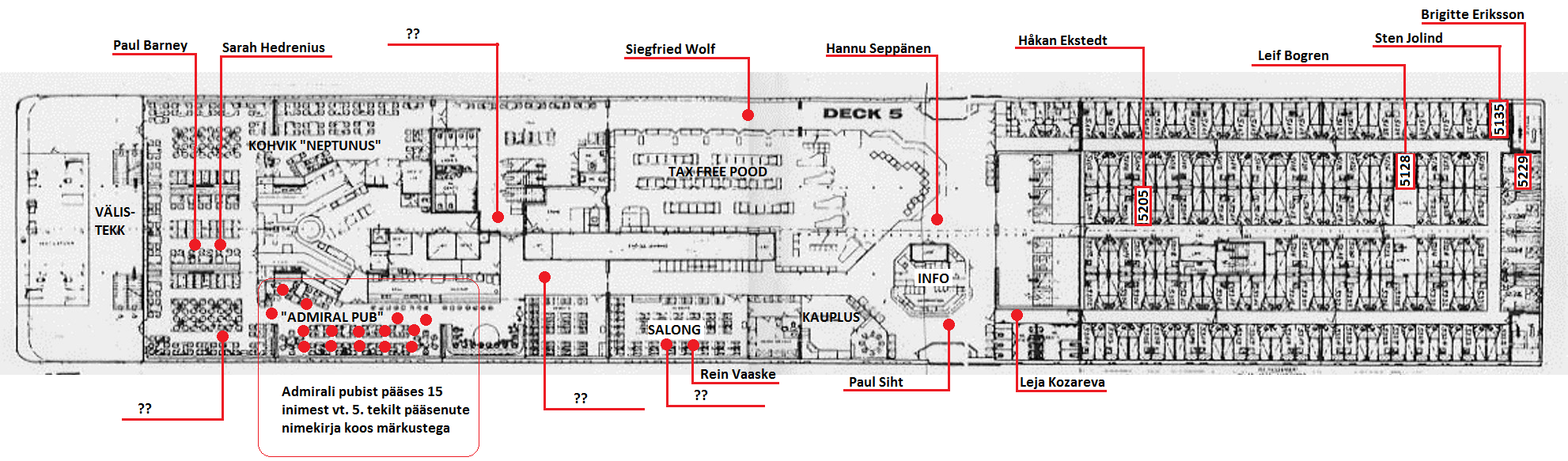 - Ta jagas tegelikult autoteki all asuvat kajutit 1026 veel 3 inimesega, kuid tundis end halvasti ja kartis, ning kolis laeva aja järgi juba pärast südaööd ca 00.30, 6. teki ahtrisse avatud tekile