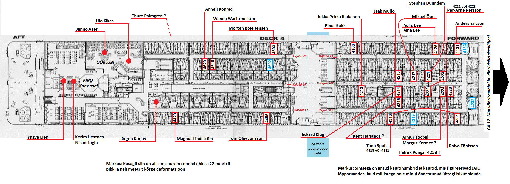 Isikud, kellel olid kajutid 4 tekil, kuid kes õnnetuse hetkel ei viibinud kindlasti oma kajutis, vaid kusagil mujal mõnel teisel tekil. Nendeks on: