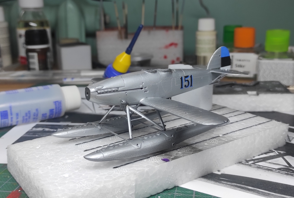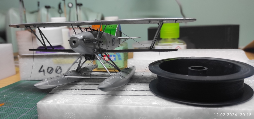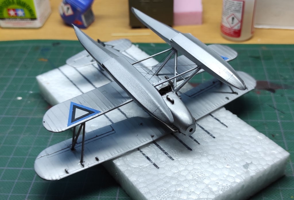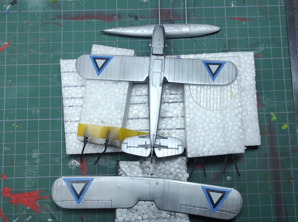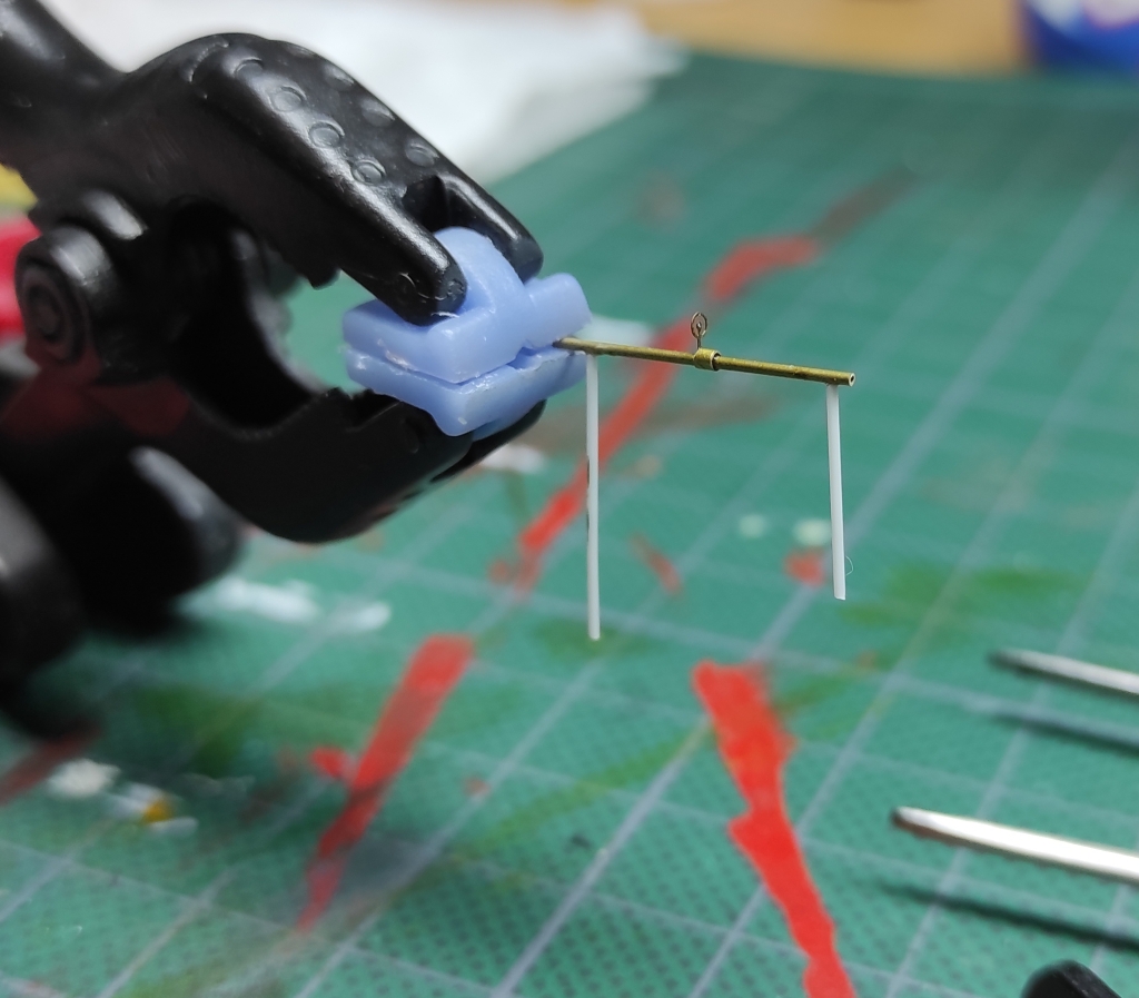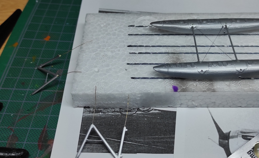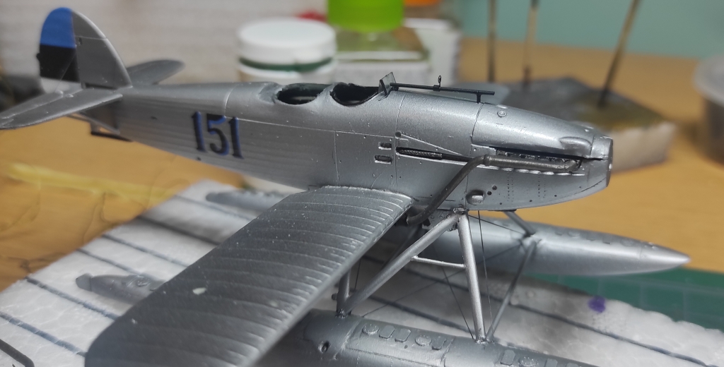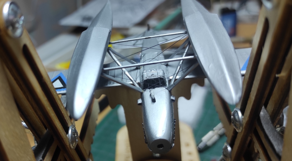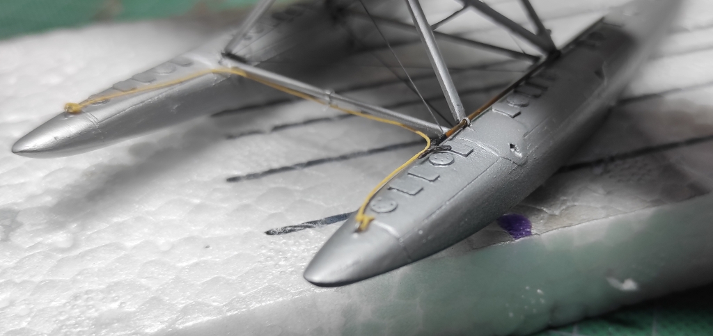 Aga edasi, ämblikut tegid oma töö ära: aeg oli lisada veel nipetnäpet , nagu antennid , tuled ... sellele pildile jäi kütusepaagi õhutustoru : ja viimase asjana lisandusid pootshaak ja pontoonidele köis. Jällegi, pea igal fotol oli üks neist alati kohal ja enamusel olid mõlemad esindatud. Pootshaaki oli kusjuures osadel fotodel ka bambusvarrega , oli suur ahvatlus aga 1/72 bambusvars ei tulnud just mitte kõige parem, läks tavaline rehavars . Köis tehtud niidist mida sai mitu korda läbi svammi sikutatud, svamm oli eelnevalt gatori liimi vesilahusega immutatud ( suhe umbes 1:20 le vee kasuks), ise jäin täitsa rahule , erilisi peeneid udeme karvu nagu ei paista.