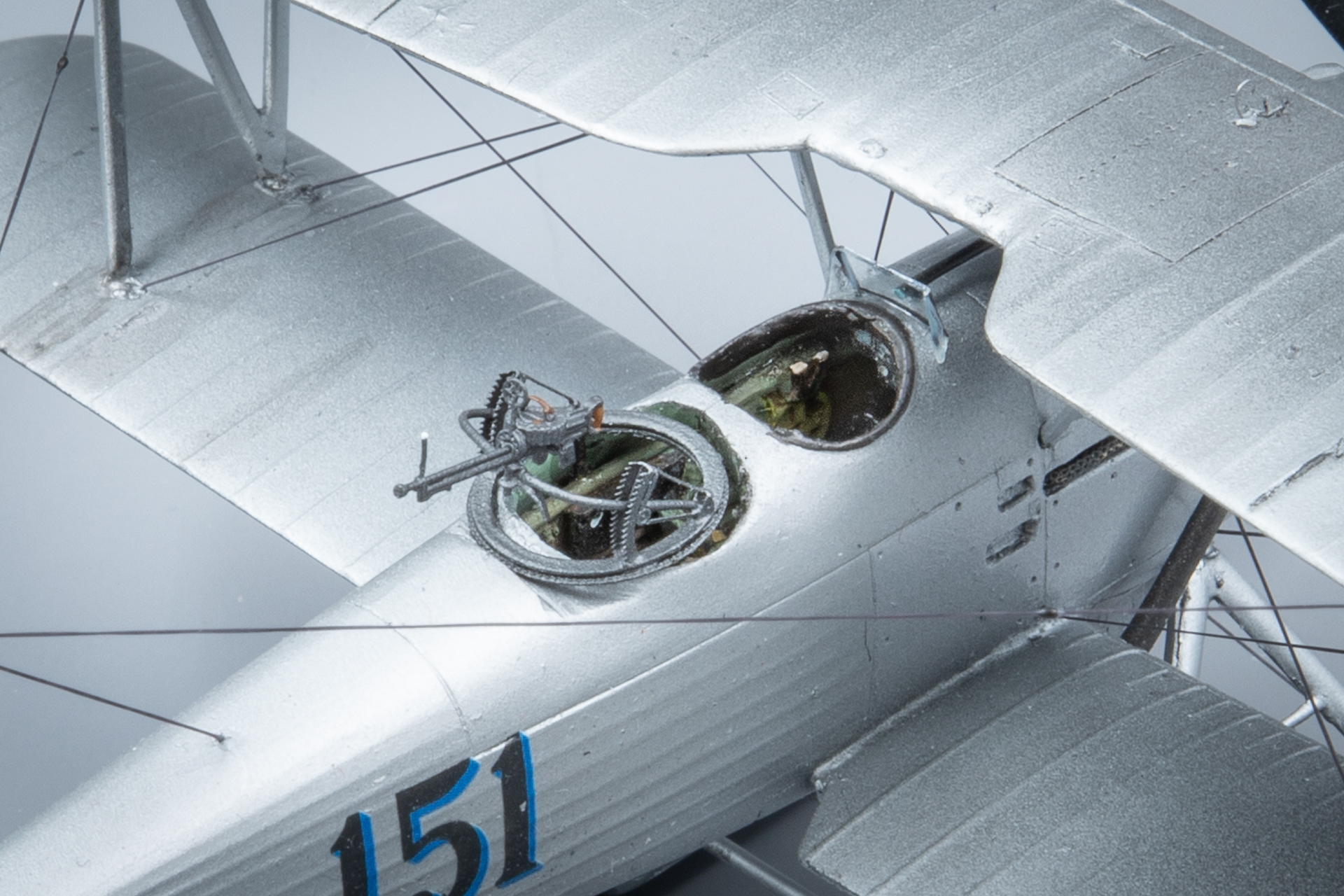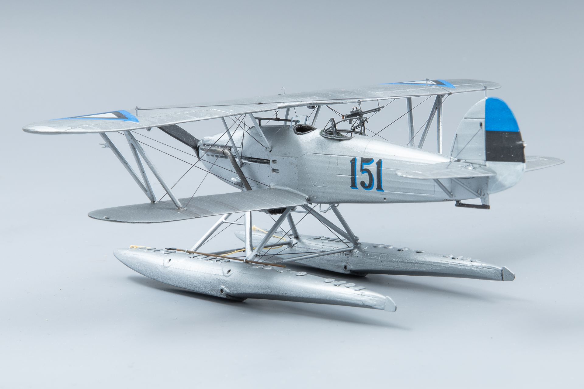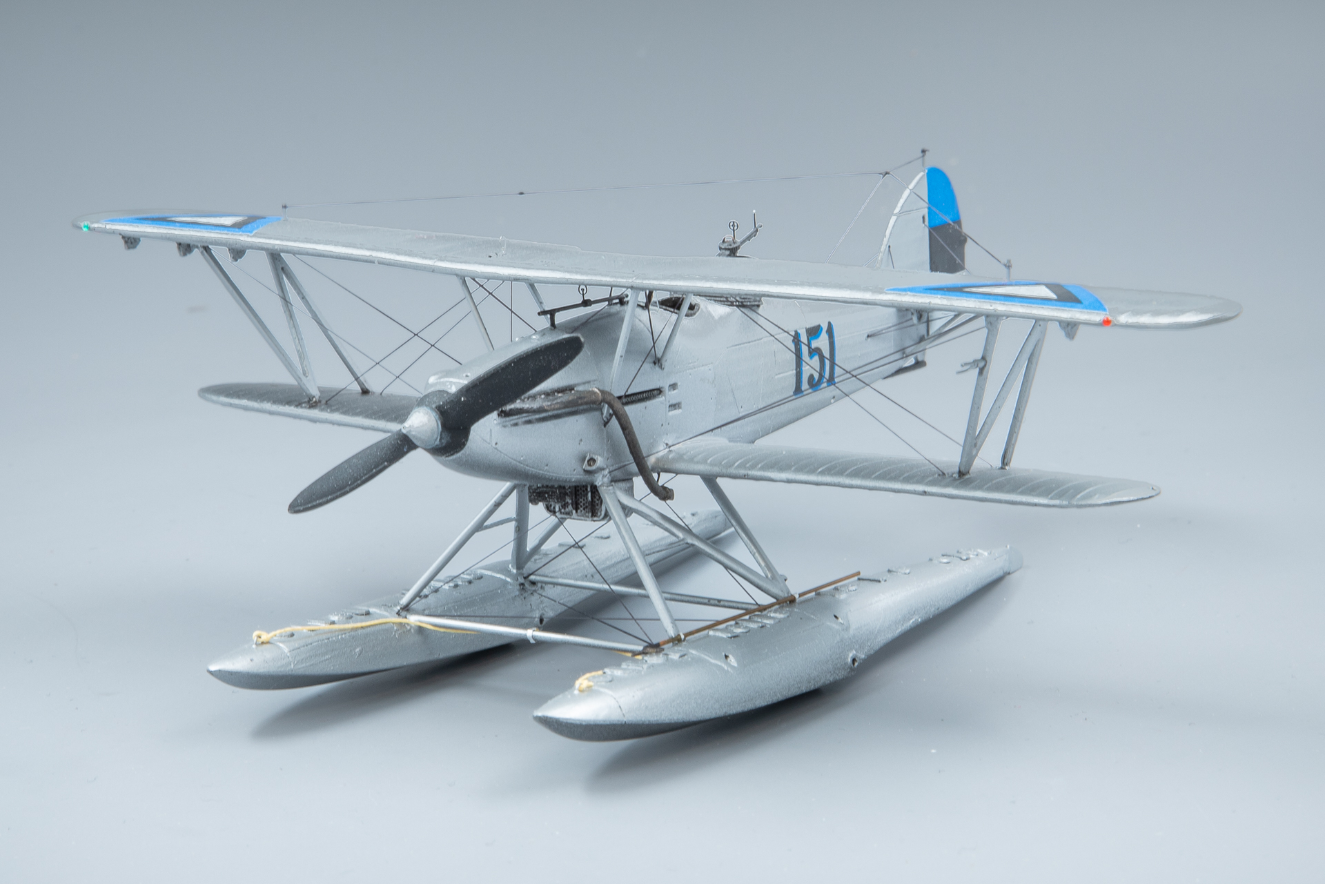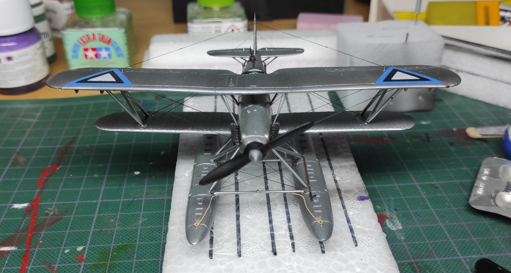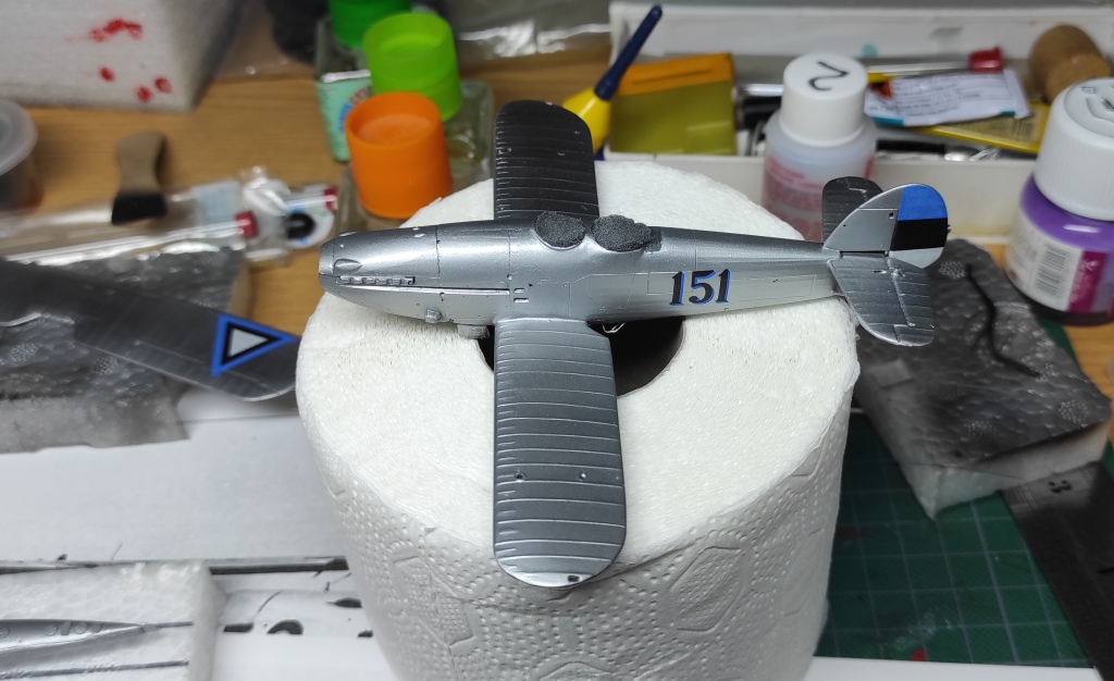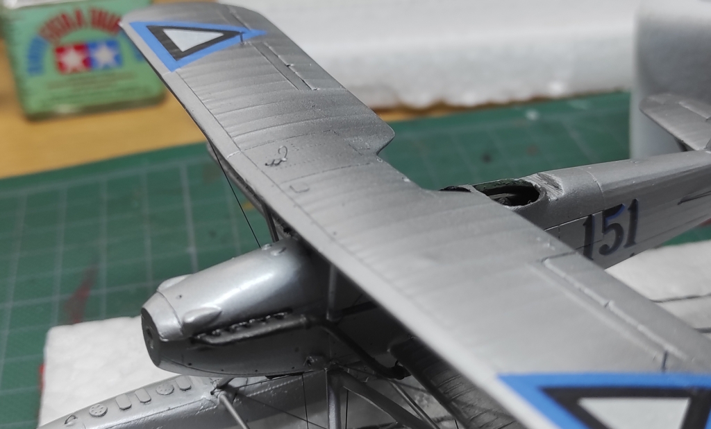 Aga edasi, ämblikut tegid oma töö ära: aeg oli lisada veel nipetnäpet , nagu antennid , tuled ... sellele pildile jäi kütusepaagi õhutustoru : ja viimase asjana lisandusid pootshaak ja pontoonidele köis. Jällegi, pea igal fotol oli üks neist alati kohal ja enamusel olid mõlemad esindatud. Pootshaaki oli kusjuures osadel fotodel ka bambusvarrega , oli suur ahvatlus aga 1/72 bambusvars ei tulnud just mitte kõige parem, läks tavaline rehavars . Köis tehtud niidist mida sai mitu korda läbi svammi sikutatud, svamm oli eelnevalt gatori liimi vesilahusega immutatud ( suhe umbes 1:20 le vee kasuks), ise jäin täitsa rahule , erilisi peeneid udeme karvu nagu ei paista.