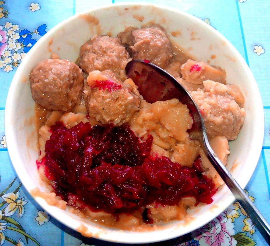 Sees viis (või oli isegi kuus?) päris suurt lihapalli. Lihapallid päis hea maitsega (üllatavalt hea maitsega... eelarvamus oli tagasihoidlikum)