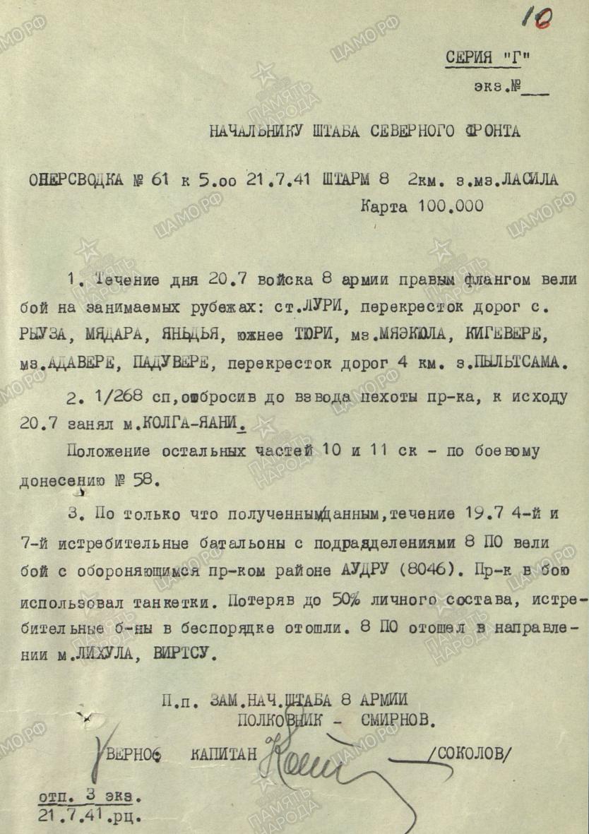 [dateeritud 20.7.] Rotarmist Nikolei Hurda, vom 7.Vernichtungs Btl. aus Reval, sagt aus: [...] Vorgestern kehrten sie nach Reval zurück und wurden sofort zum Pernau-Unternehmen verwandt. Das ganze Btl. etwa 300 Mann stark kam bis Lihula. Von hier aus wurden 2 L.K.W. mit etwa 65 Mann in Richtung Pernau vorgeschickt. Bei Audru stießen sie auf deutsche Truppen, die die Abteilung vernichteten. Hurda allein geriet in Gefangenschaft.