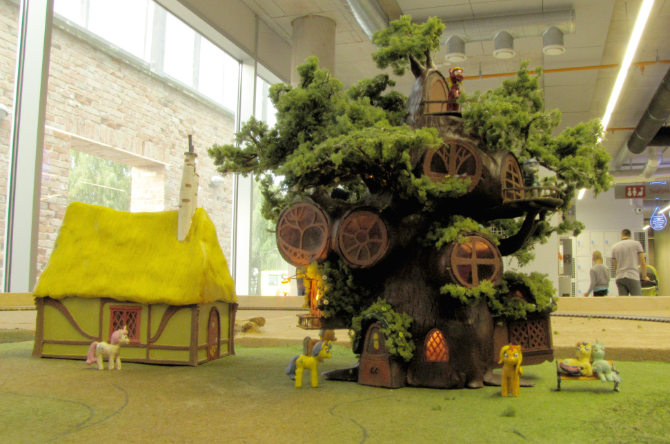 Sai siis see omanäoline pesa kah valmis. Kas just nüüd pesa, see on hoopis Ponyville raamatukogu. Tüvi on polümeersavist, mis sai vastava kujuga paberist jorna otsas vormitud. Pärast savi kõvastamist rookisin paberi välja. Okstega oli pikem kaalumine, kas põdrasammal või traadiväänutamine, viimaks otsustasin traadiväänamise kasuks. (nn twisted wire tree). Kaks viga lipsas sisse: juhe, mis kooritud sai, oli veits peenekiuline, oksad jäid veidi pehmeks (hilisemal lähemal uurimisel soovitati kuskil tutorialis maandusjuhet kasutada, millel on kiud jämedamad ja tugevamad). Teiseks ma kasutasin poroloonipuru tarvis spray liimi, mida Noores Tehnikus müüakse ja mis spetsiaalselt poroloni tarvis tehtud. See aga oli vahune ja jäi valkjaks nagu nohupurtsatus. Õnneks ei paista väga välja rohelise alt, aga see meeldinuks paremini, kui liim jäänuks läbipaistvaks.