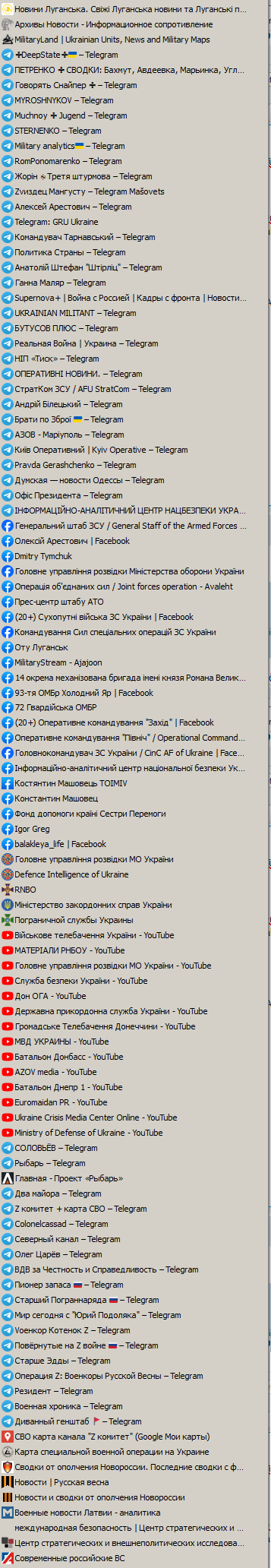 Kui ma veel siia UKR sõja kohta käivat opinfot otsisin ja panin, siis nt alates 2022 olid pideva jälgimise all järgmised allikad:
