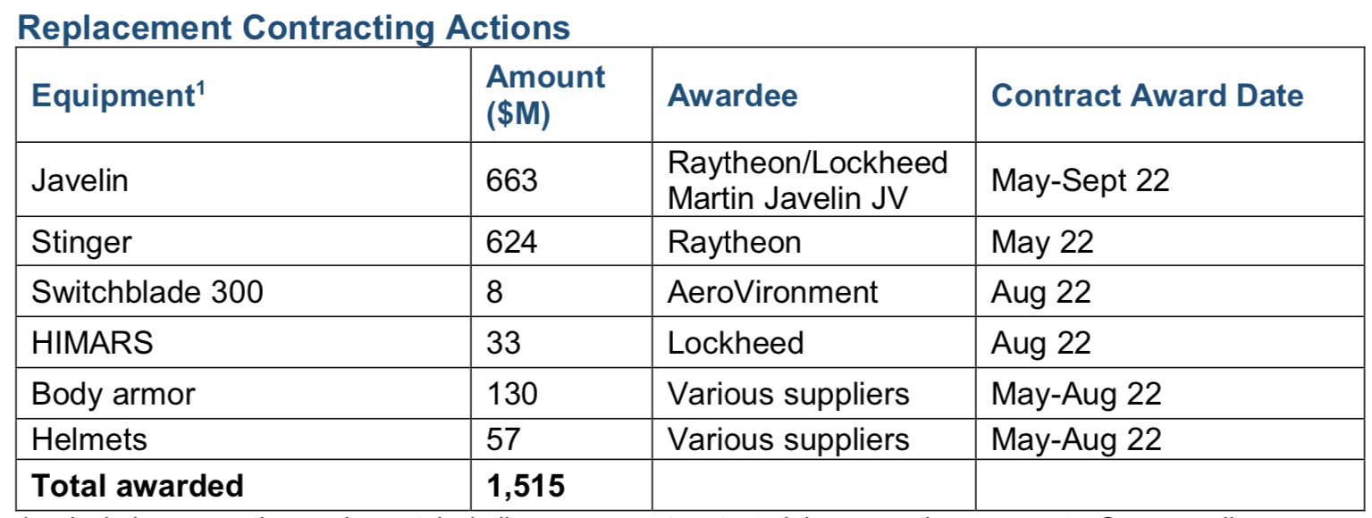 2022. aasta septembrikuu alguse seisuga USA abist Ukrainale. Esimeses tabelis on asjad, mis Ukrainale osteti. Teises on asjad, mis Ukrainale anti oma ladudest ja mille asendamine on vaja kinni maksta. Viimases tabelis on lihtsalt võrdluseks ülevaade USA iga-aastasest relvaabist Iisraelile.