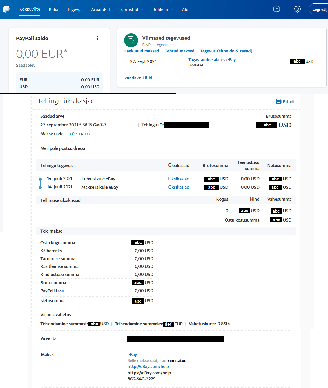 "abc" summa on igalpool üks ja see sama ehk, et 27.09 "Tagastamine alates eBay" (midaiganes see tähendab) summa on täpselt sama, mis 14.07 tehtud makse kauba eest ostjale läbi eBay.