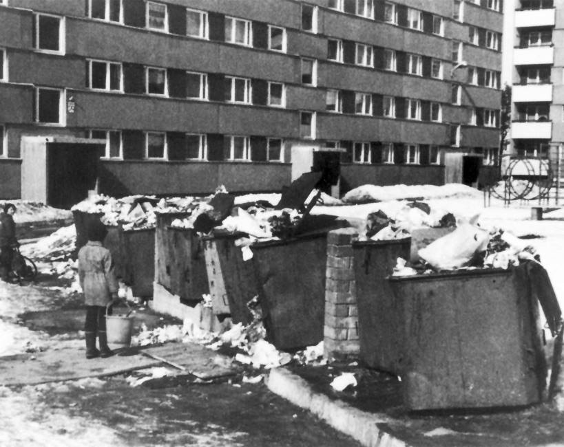 Prügikastidega foto aastaarvuks pakuks '89...'91 e. suure bensiinikriisi aega. Isegi miilitsa/politsei sõidukitele oli ette nähtud 5l vahetuse kohta, mis siis veel prügiautodest rääkida. Aga avalikus kohas uinakut tegevad tüübid on tänapäeval alkoholiga kauplevate poodide juures harilik nähtus. Elan ise ühe suurema poe kõrval ja võin iga päev neid tuikuvaid ja lällavaid tüüpe oma magamistoa aknast vaadata. Suvisel ajal oli ka sinivalge auto üsna sage külaline, kes mõne põõsavilusse tuttu jäänud ja märjaks lastud pükstega tegelase minema sõidutas.