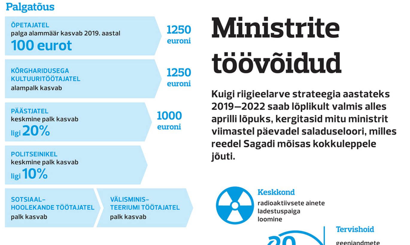 Reede õhtul värske eelarvestrateegia (RES) põhijoontes kokku leppinud valitsus lubab nelja-viie valdkonna riigitöötajatele palgatõusu ning suuri rahasüste riigikaitsesse ja e-teenustesse. Siiski on selgunud, et osa palku ei tõuse ühekorraga, vaid astmeliselt.